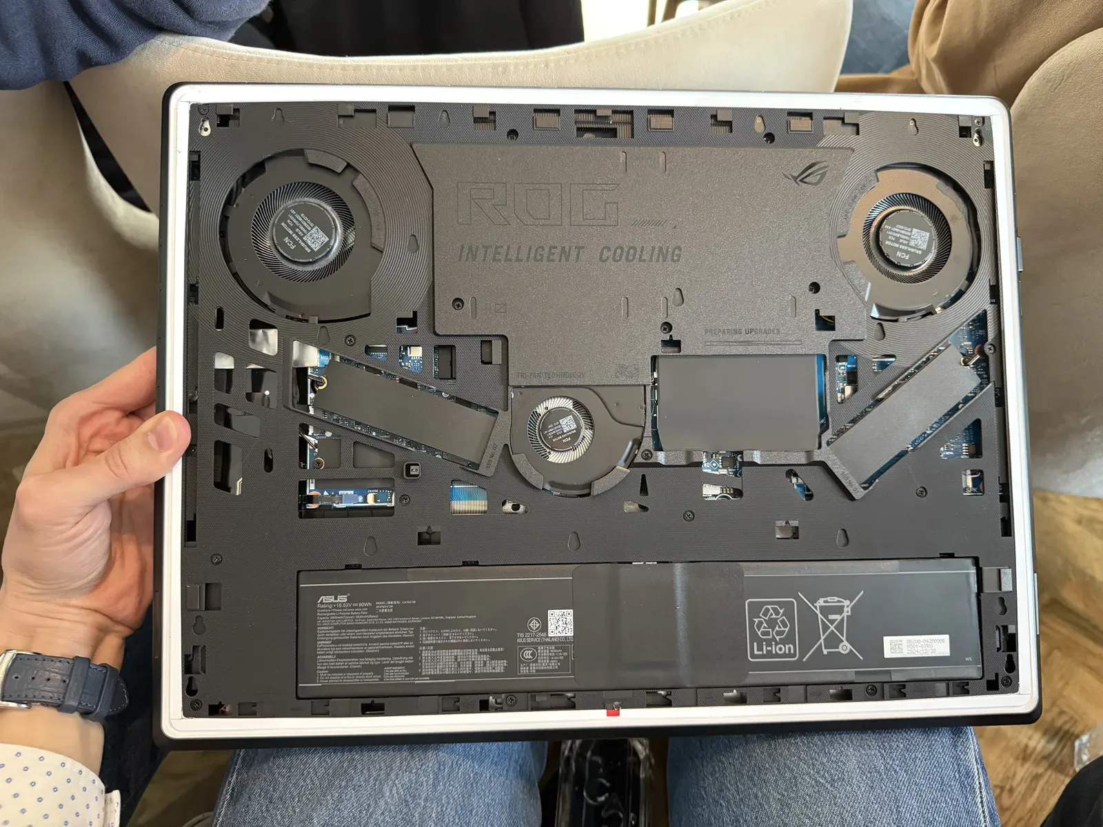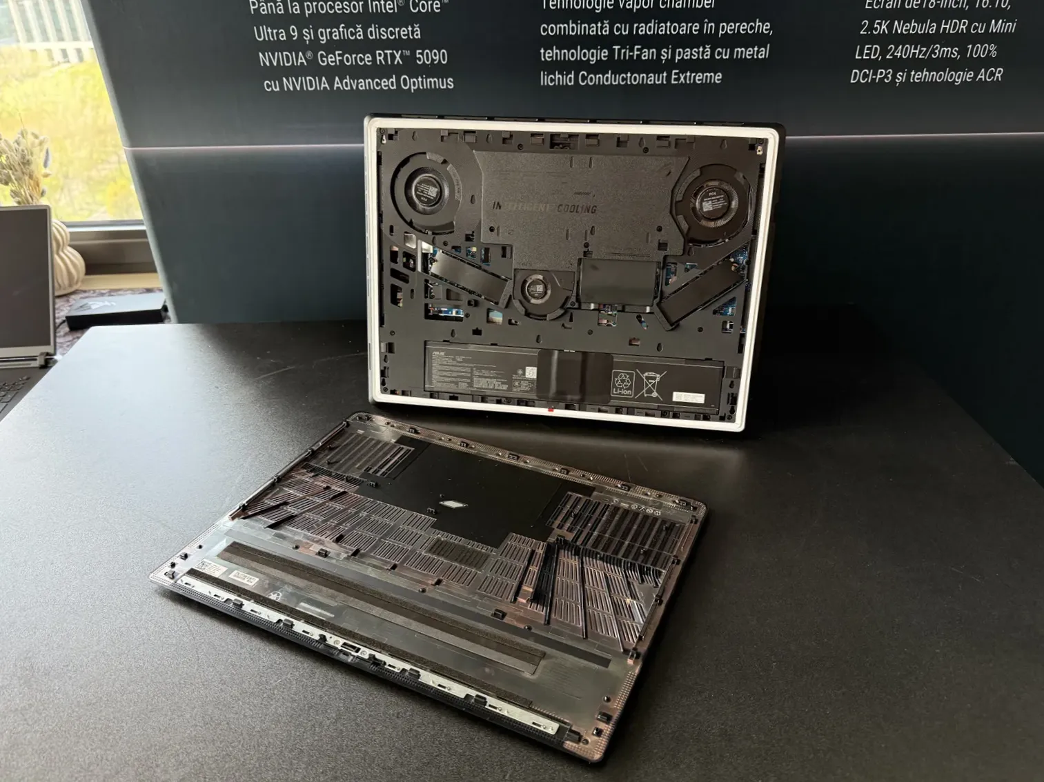 Mi-a plăcut și că este unul dintre puținele laptopuri care pot fi demontate fără a avea nevoie de unelte. Capacul de pe partea inferioară se scoate folosind cleme și acolo ai acces direct la SSD-uri și baterie, iar un upgrade viitor este ușor de făcut. Sincer să fiu, probabil vor trece foarte mulți ani înainte ca un astfel de model să aibă nevoie de upgrade. Faptul că poți scoate atât de ușor capacul permite însă să cureți rapid praful care se poate strânge prin sistemul de răcire (care include de toate: metal lichid pentru contact, heatpipes și ventilatoare de putere).