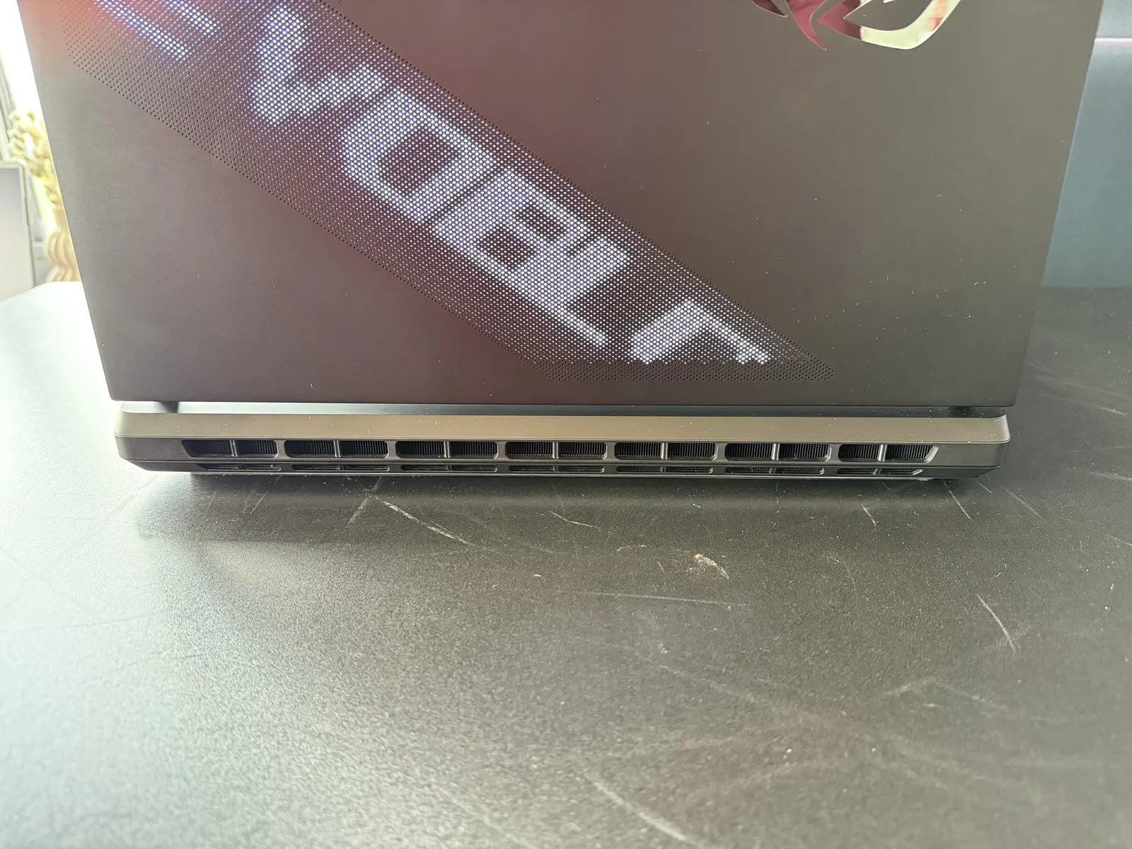 Și ca și cum specificațiile nu erau de top, mi s-a părut că fiecare element este bine construit. De exemplu, iluminarea ambientală (un contur de lumină în jurul laptopului) era foarte puternică, intensă la culoare. Capacul monitorului are și pe exterior acel afișaj AniMe Matrix pe care poți pune tu texte sau pictograme sau ce îți dorești.