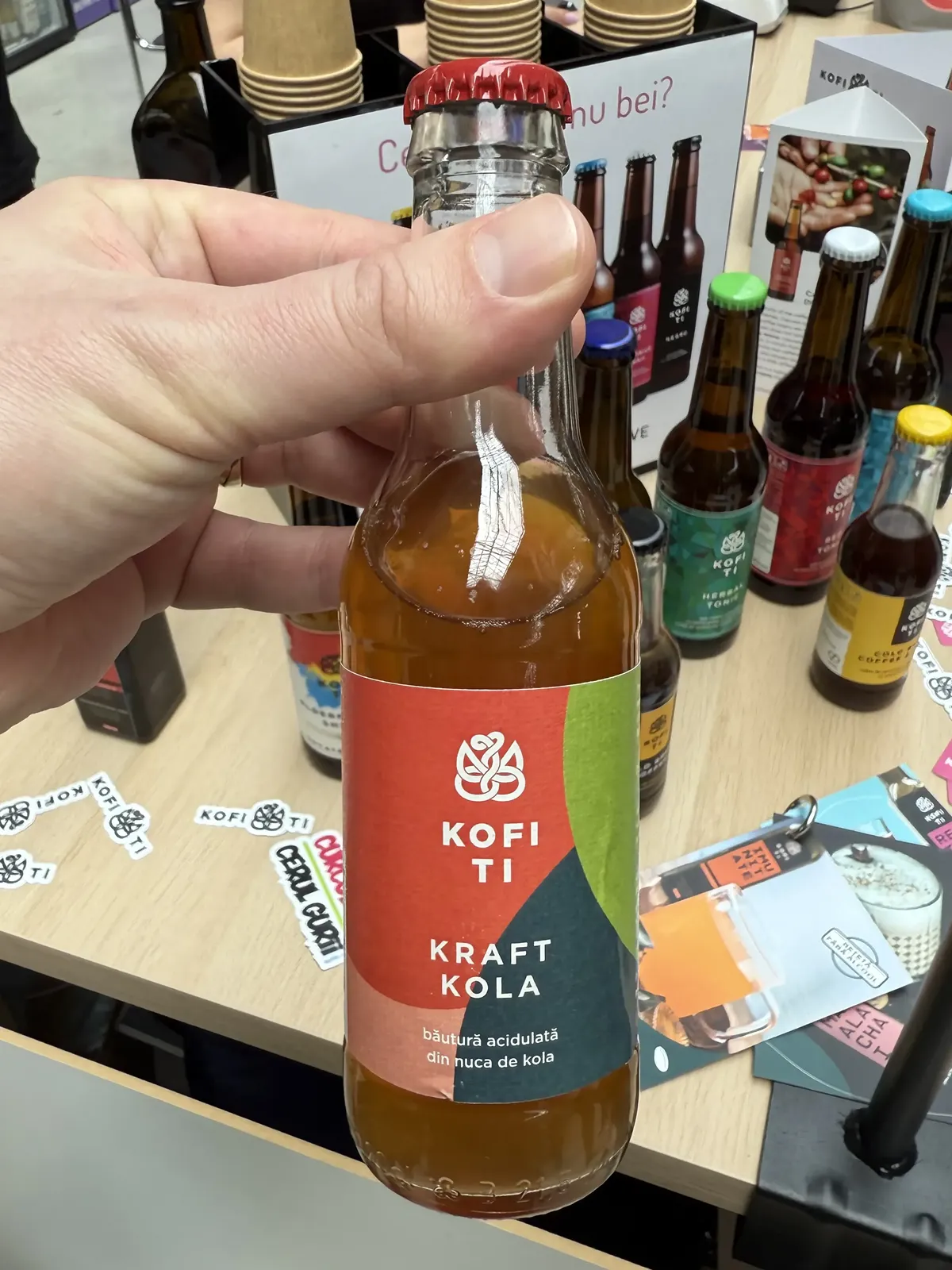 Kofi Ti (așa se scrie oficial, nu Kofiti) scoate și Cola artizanală. Kraft Kola se numește oficial, mi s-a părut foarte gustoasă și nu cred că se vede bine în fotografia cu spatele sticlei, dar scrie acolo că are 6,72% zaharuri, departe de cei 10% din Cola normală, ceea ce mi se pare o veste bună.