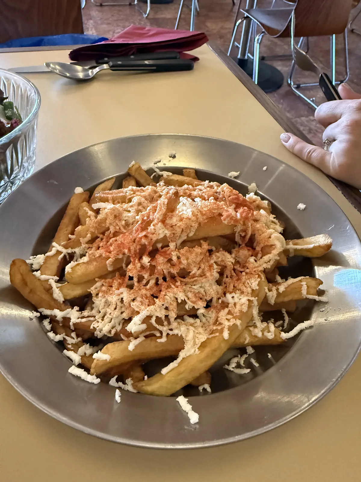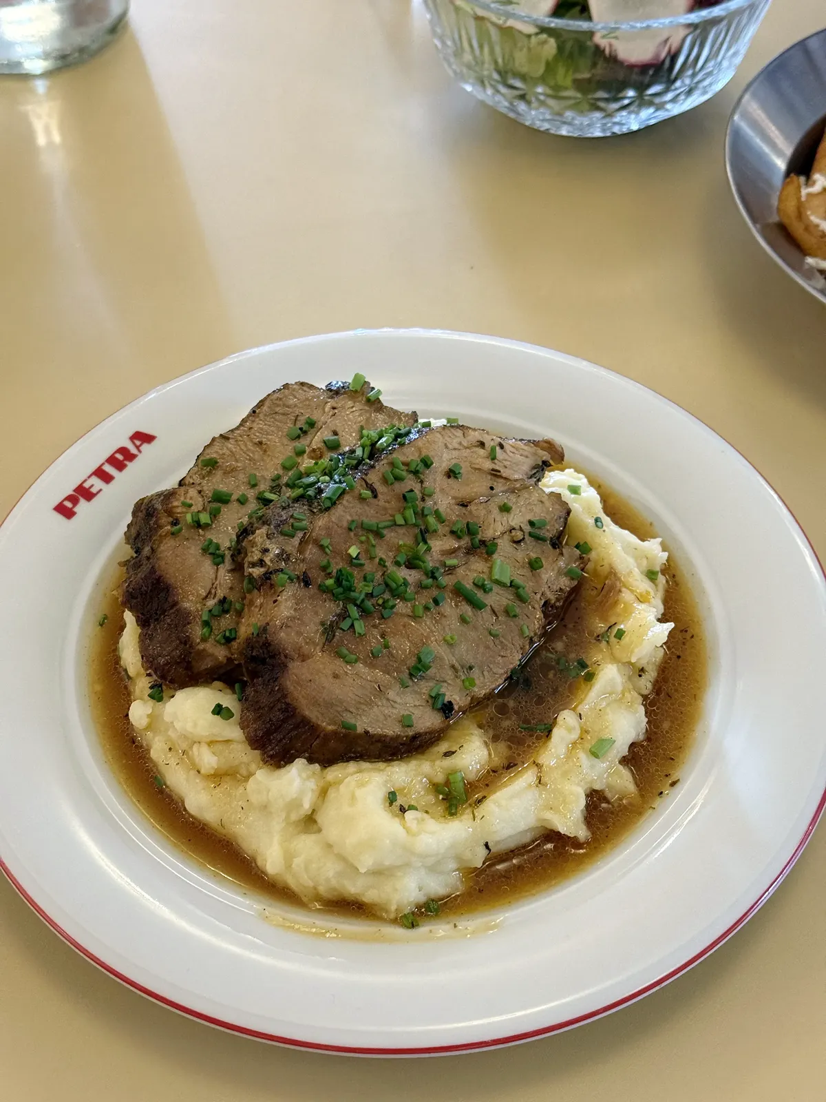 Petra s-a dovedit foarte bun. Restaurantul, la etajul 1 în hala veche, a devenit celebru acum câteva luni printre hipsteri sau cel puțin așa mi s-a părut mie. Noi am fost abia acum, am găsit un restaurant absolut normal, cu atmosferă prietenoasă și mâncare excelentă. Supa de pui cu găluște a fost ca la bunică-mea acasă, cu carne multă, găluște bine făcute și o supă consistentă, în care se simțea găina. O porție de friptură de porc cu piure a avut două cotlete groase de porc, de puteam la fel de bine să o împart cu Matilda și plecam amândoi sătui, iar cartofii prăjiți cu telemea au fost foarte buni, dacă vă place această combinație.