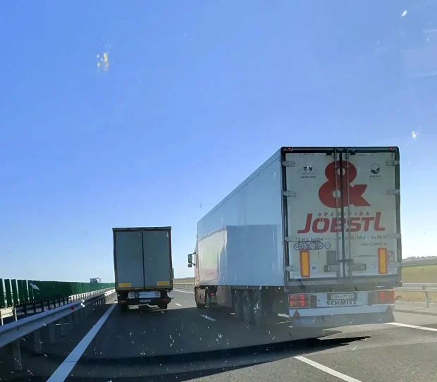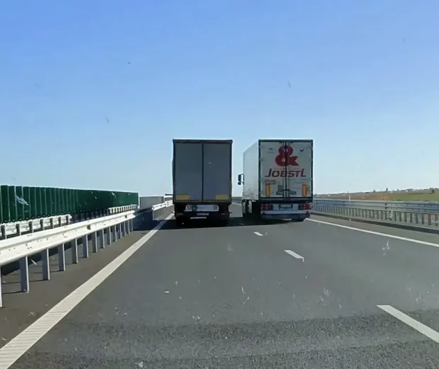Haideți să vă arăt și ceva amuzant. Autostrada A7 de la Focșani la Buzău. Mă îndreptam spre două TIR-uri care mergeau în șir. Când ajung aproape de ele, camionul din spate intră pe banda 2 și începe devansarea primului camion… cu o viteză practic egală cu a acestuia.