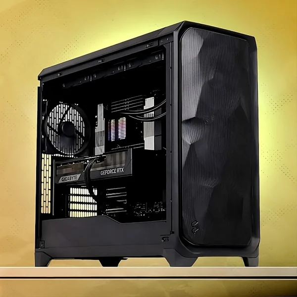 ➡️ Carcasă Fractal Design Meshify 3 XL Black TG Light Tint, care costă în jur de 1100 de lei. Este o carcasă neagră, cu aspect serios, full tower, având în față o grilă perforată sub care se află 3 ventilatoare de 140 mm.