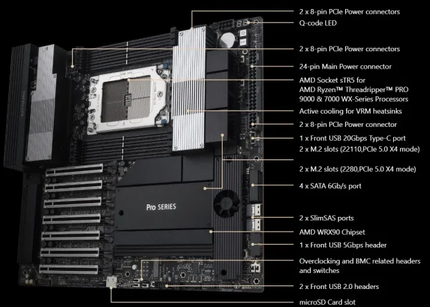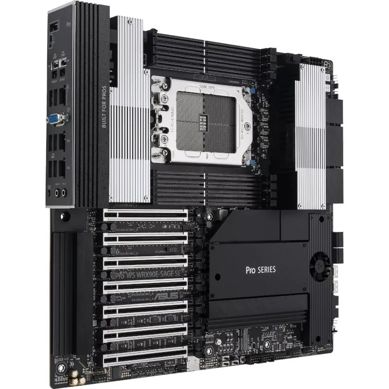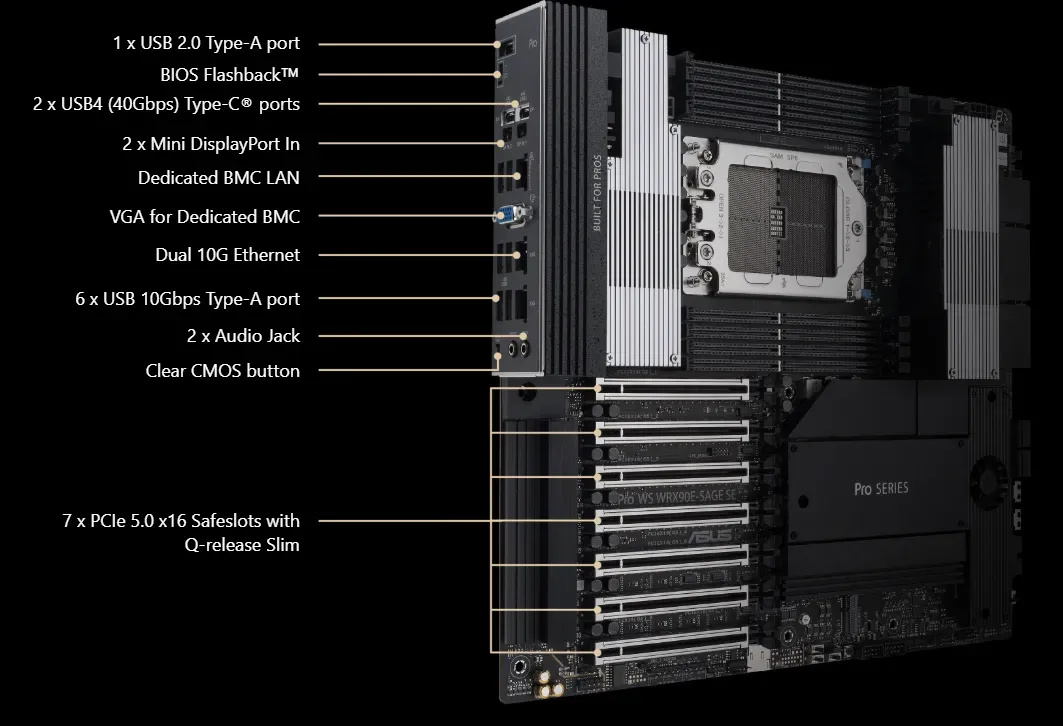 Ce face o placă de bază atât de scumpă? Din ce citesc pe site-ul oficial Asus, are 7 sloturi PCI-Express 5.0 x16, de exemplu. Are un socket AMD sTR5 pentru procesoare specializate, 4 sloturi M.2 PCI-Express 5.0 pentru stocare, suportă 2 TB de memorie RAM ECC în 8 sloturi, dual 10 Gbps LAN plus un port Gibabit dedicat pentru controllerul BMC din interior, remote management, patru porturi USB4, etaje de alimentare specializate pentru overclocking.