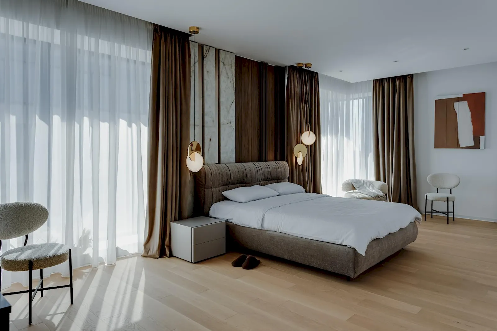 Are 5 camere, din care 4 dormitoare, 2 băi, suprafață totală 335 mp, o terasă de 20 mp, 3 locuri de parcare în subteran. Se închiriază cu 11.000 de euro/lună pe site-ul One, deși pe imobiliare este listat la 10.000 euro/lună. Bănuiesc că oricum este negociabil.