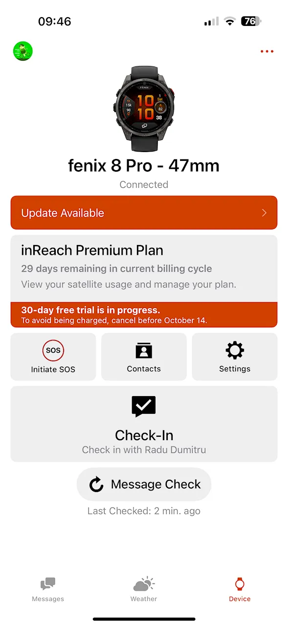 Totul s-a sincronizat desigur și cu Garmin Messenger din telefon, am regăsit acolo toată conversația. Ceasul mai integrează funcții și de trimis check-in-uri automate cu poziția ta, iar tot prin satelit poți cere update-uri meteo pentru zona în care te afli.