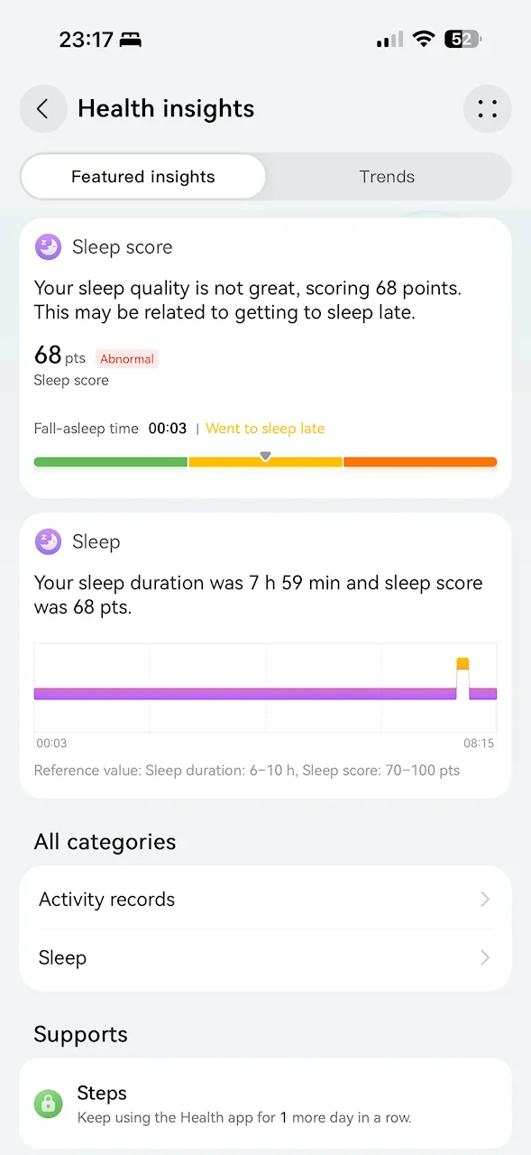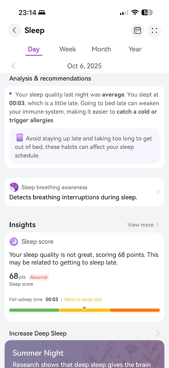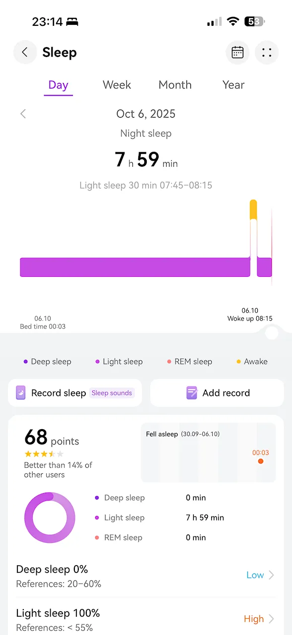 Ceasul face și statistici detaliate cu toate acestea. Îți spune etapele somnului, îți dă explicații pentru ce a fost bine și ce nu, plus recomandări. Poți vedea datele pe zi, săptămână și alte perioade, poți face corelații cu alți indicatori (de exemplu temperatura pielii) șamd.