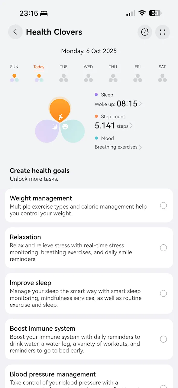 Tot pe partea de Health, există aplicația Stay Fit în care poți nota rapid câte calorii ai consumat la o masă, un Health Glance care în 60 de secunde îți măsoară un număr mare de indicatori de sănătate, exerciții de respirat ghidate de ceas, Emotional Wellbeing în care să notezi că nu te înțelege nimeni și altele.