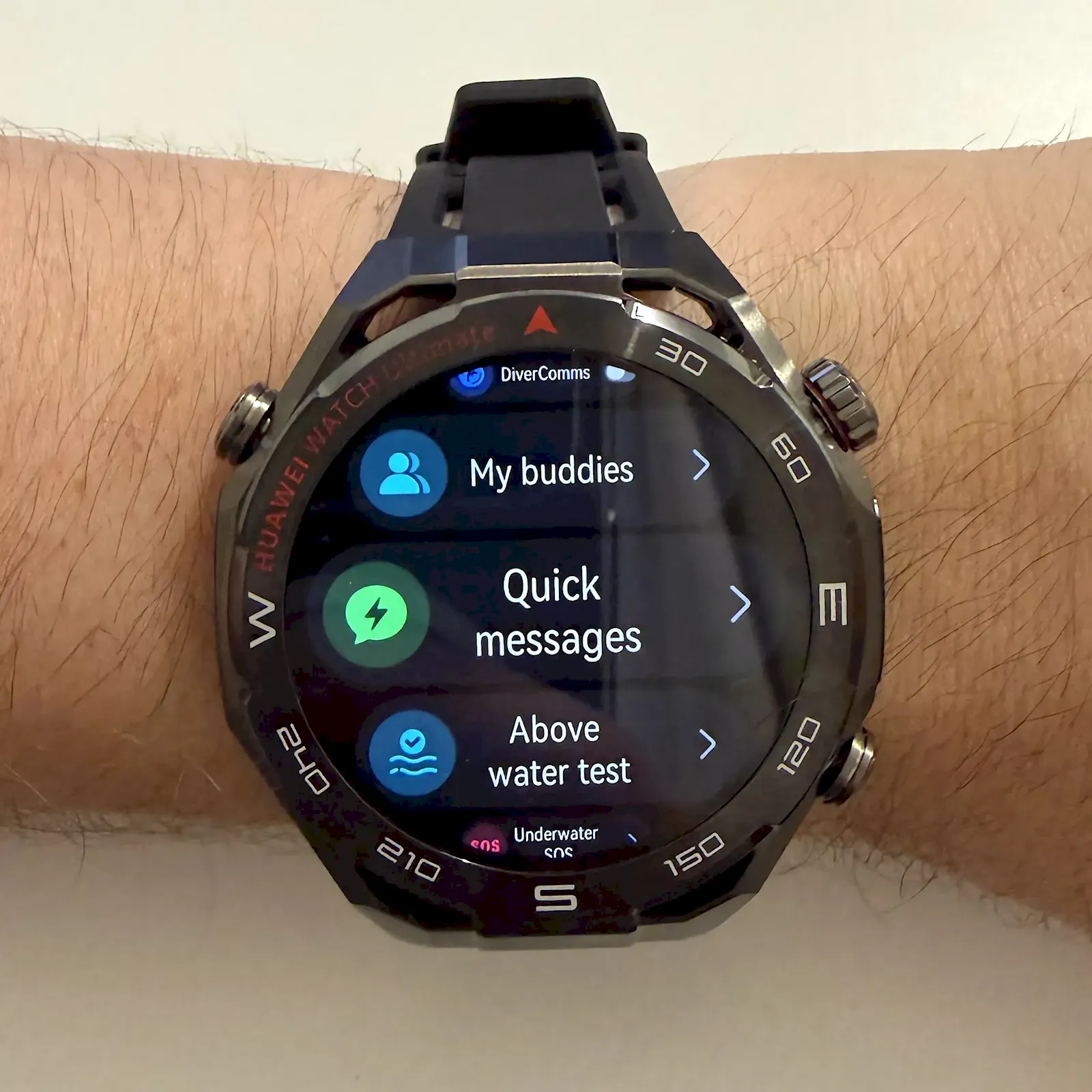 Huawei Watch Ultimate 2 include deci o funcție prin care emite sunete sub apă, iar undele de presiune ale acestora sunt recepționate de alte ceasuri sau de dispozitive de comunicație tip sonar 3rd party. Știu că a plouat mult în București în această perioadă, dar nu atât de mult încât să pot testa această funcție. O poți testa în aer liber, iar ceasul face niște bipuri de zici că-i cod Morse.