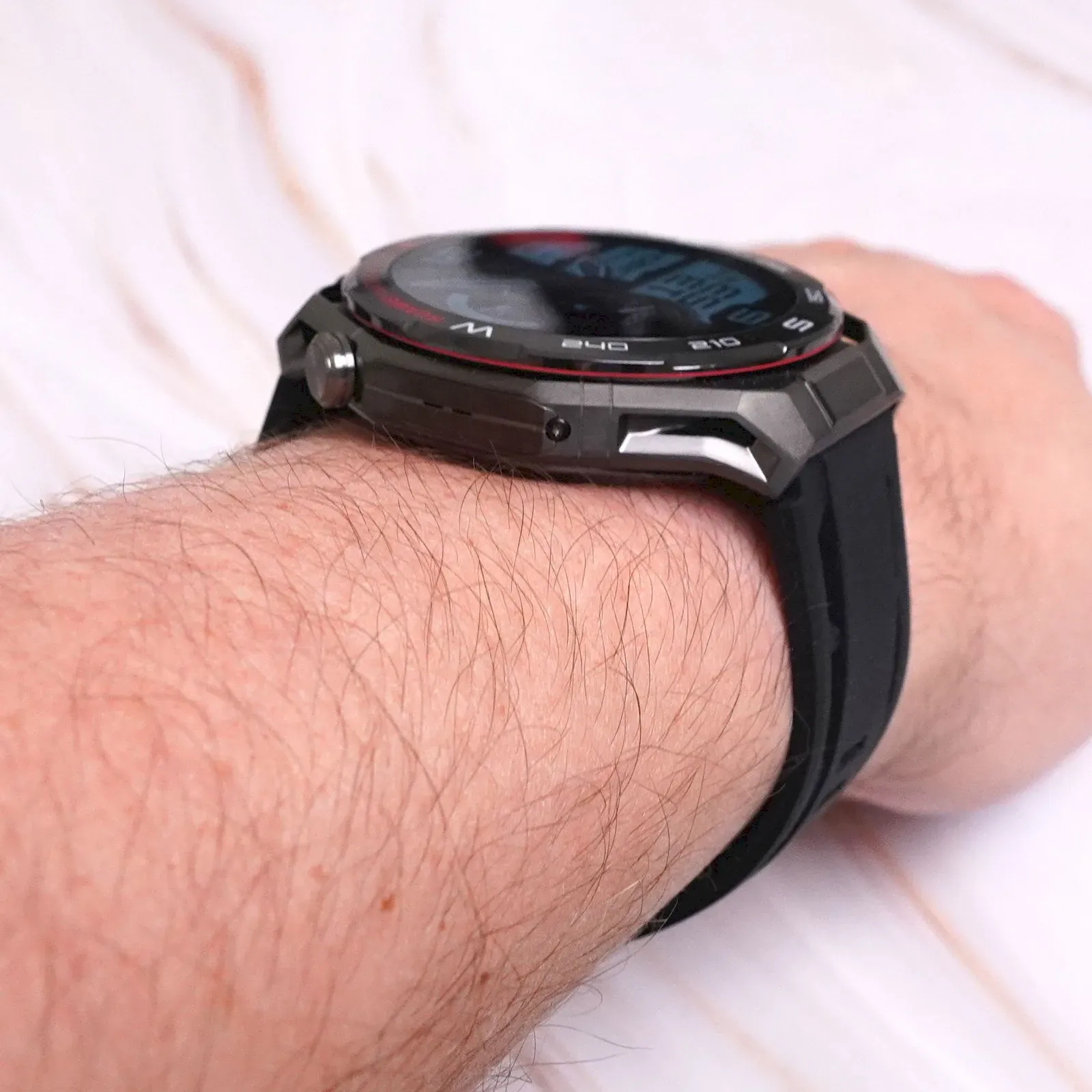 Ceasul este mare. Mie îmi place un ceas mare la încheietură, dar acesta este la limită chiar și pentru mine. Este făcut din materiale foarte bune, carcasa fiind turnată dintr-un aliaj special de metal lichid, folosit de obicei la ceasuri de lux și adus de câțiva ani și de Huawei pe gama lor de top de ceasuri.