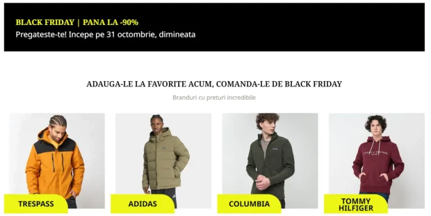 La Fashion Days, Black Friday începe mâine, pe 31 octombrie, și ține până pe 9 noiembrie. Puteți vedea deja produsele care vor fi în Black Friday: bărbați, femei, băieți, fete.