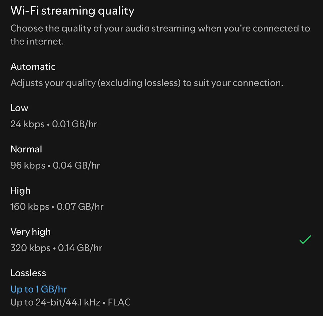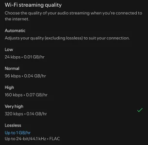 Și, într-adevăr, mergând în setări la secțiunea Media Quality am găsit și opțiunea de Lossless. Observați că are un consum foarte mare de bandă, în jur de 1 GB/oră față de 0,14 GB/oră pentru setarea imediat următoare, Very High.