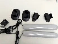 Pachetul este cel de mai jos și include și câteva accesorii de montaj. Primești doi suporți cu care pui vertical aceste bare, de exemplu pe mobilă, și doi suporți cu care poți lipi barele de ceva, de exemplu pe spatele unui televizor sau monitor sau pe “tavanul” unui raft și în alte asemenea situații. Toate sunt dintr-un plastic destul de banal, dar e de așteptat la acest preț.