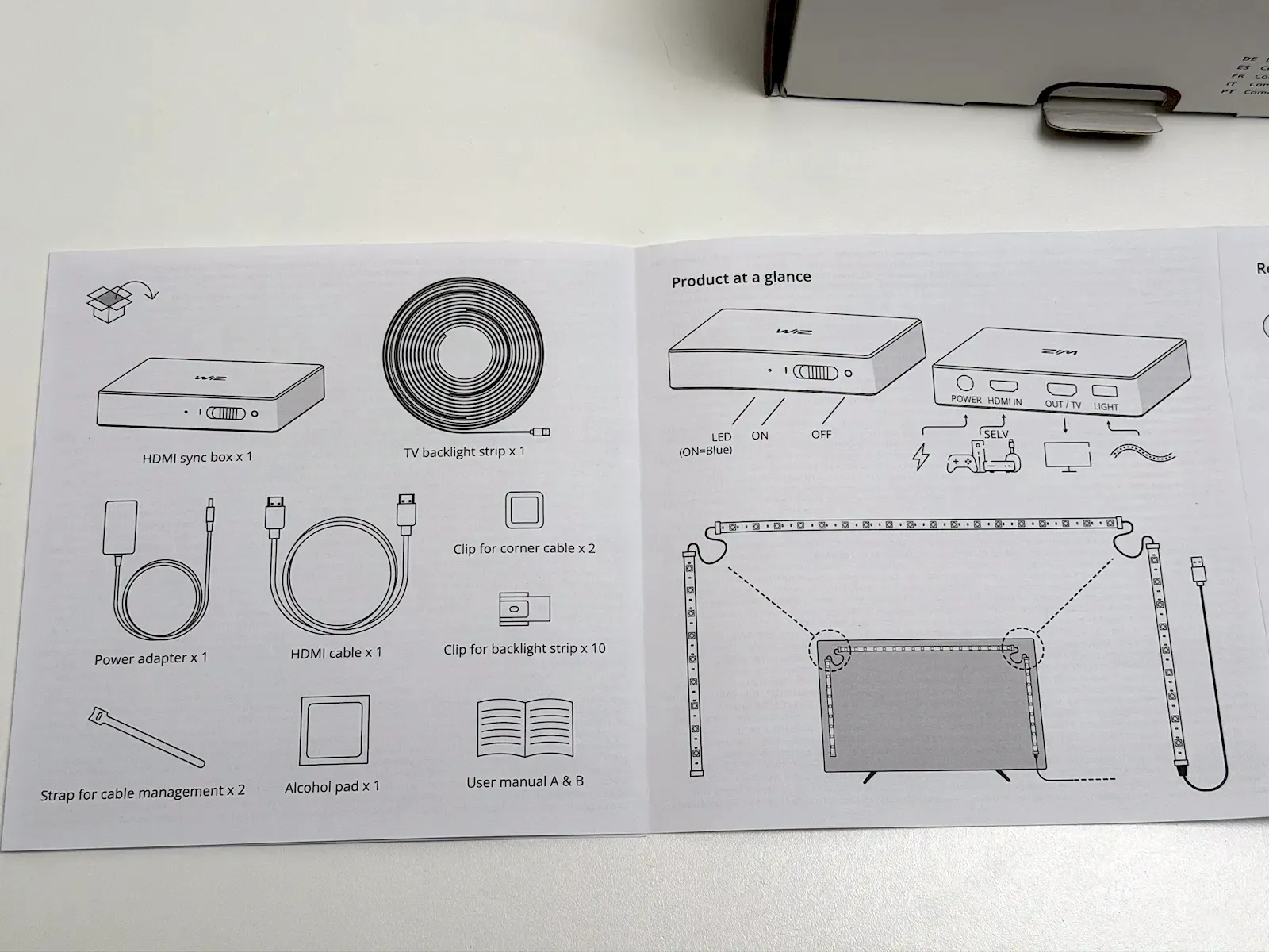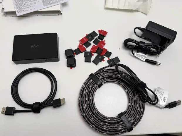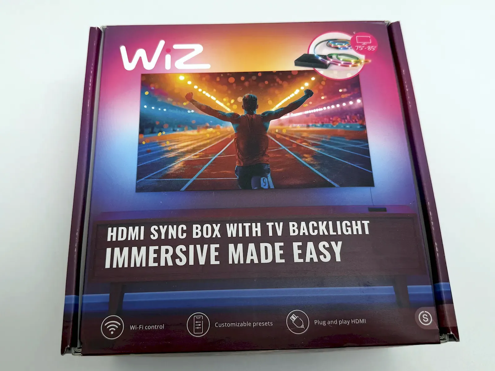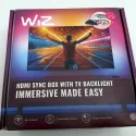Wiz mi-a trimis și un HDMI Sync Box, pachet care include și o bandă LED flexibilă de lipit pe spatele televizorului. Ideea este că semnalul video de la o consolă de gaming sau alt aparat care transmite prin HDMI prin televizor (de exemplu un PC sau set-top box) trece întâi prin acest Sync Box, care apoi controlează niște lumini în funcție de culorile din imagine.