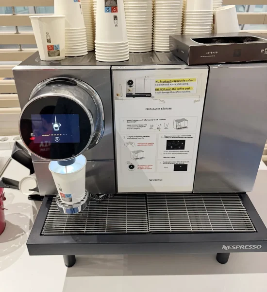 În plus, cei din aeroport au limit niște afișe mari pe aparate pe care scrie “nu împingeți capsula înăuntru, se blochează aparatul”, dar asta nu a contat. Când am fost pe acolo, un pasager din fața mea a deblocat aparatul de o astfel de capsulă împinsă cu putere în interior de către altcineva, că altfel n-am fi băut deloc cafea. Un aparat avea probleme cu presiunea, altul dădea uneori erori.