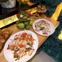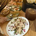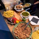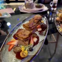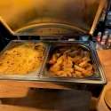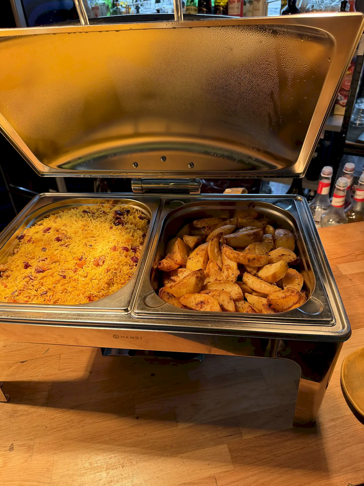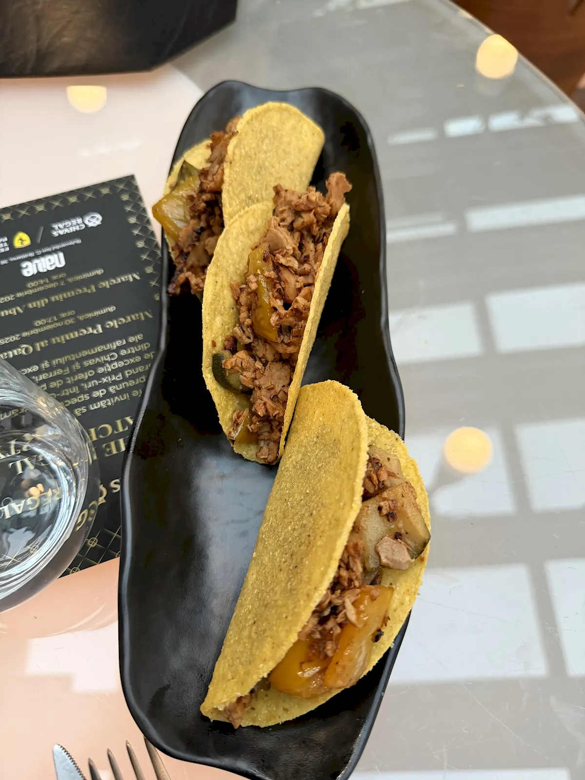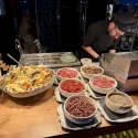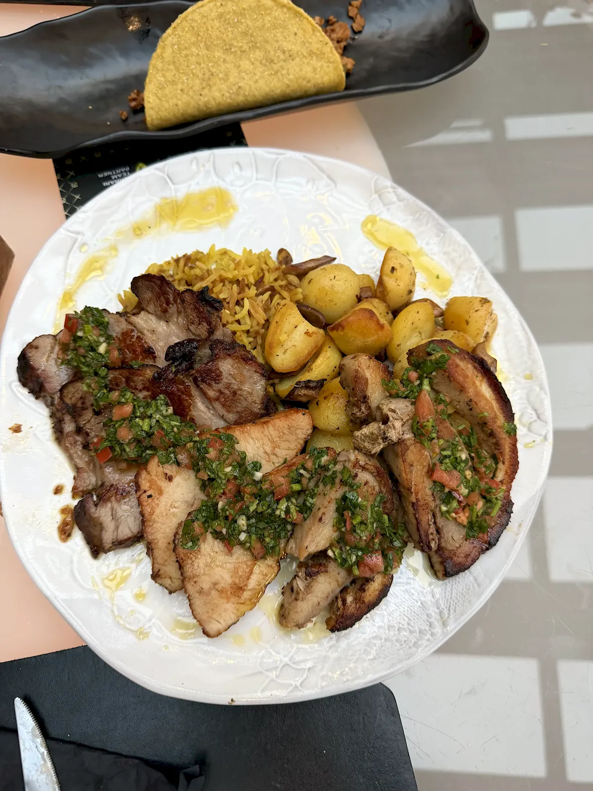 Noi am luat niște tacos și s-a oferit să ne facă un platou cu friptură din fiecare, ca să vedem cum sunt. Garniturile erau orez cu șofran și fructe uscate, plus cartofi cu unt și rozmarin. Au fost foarte bune.