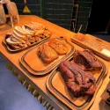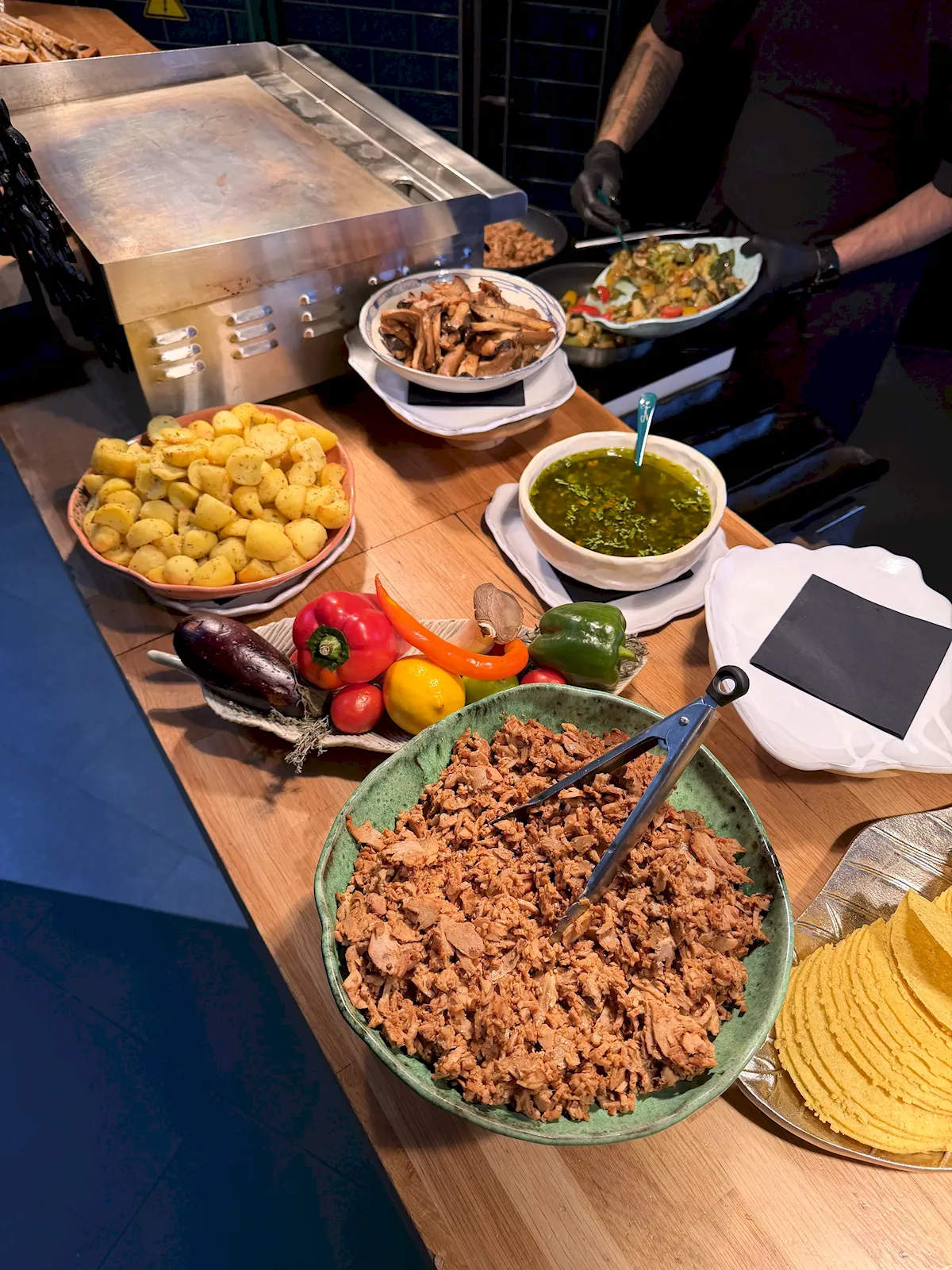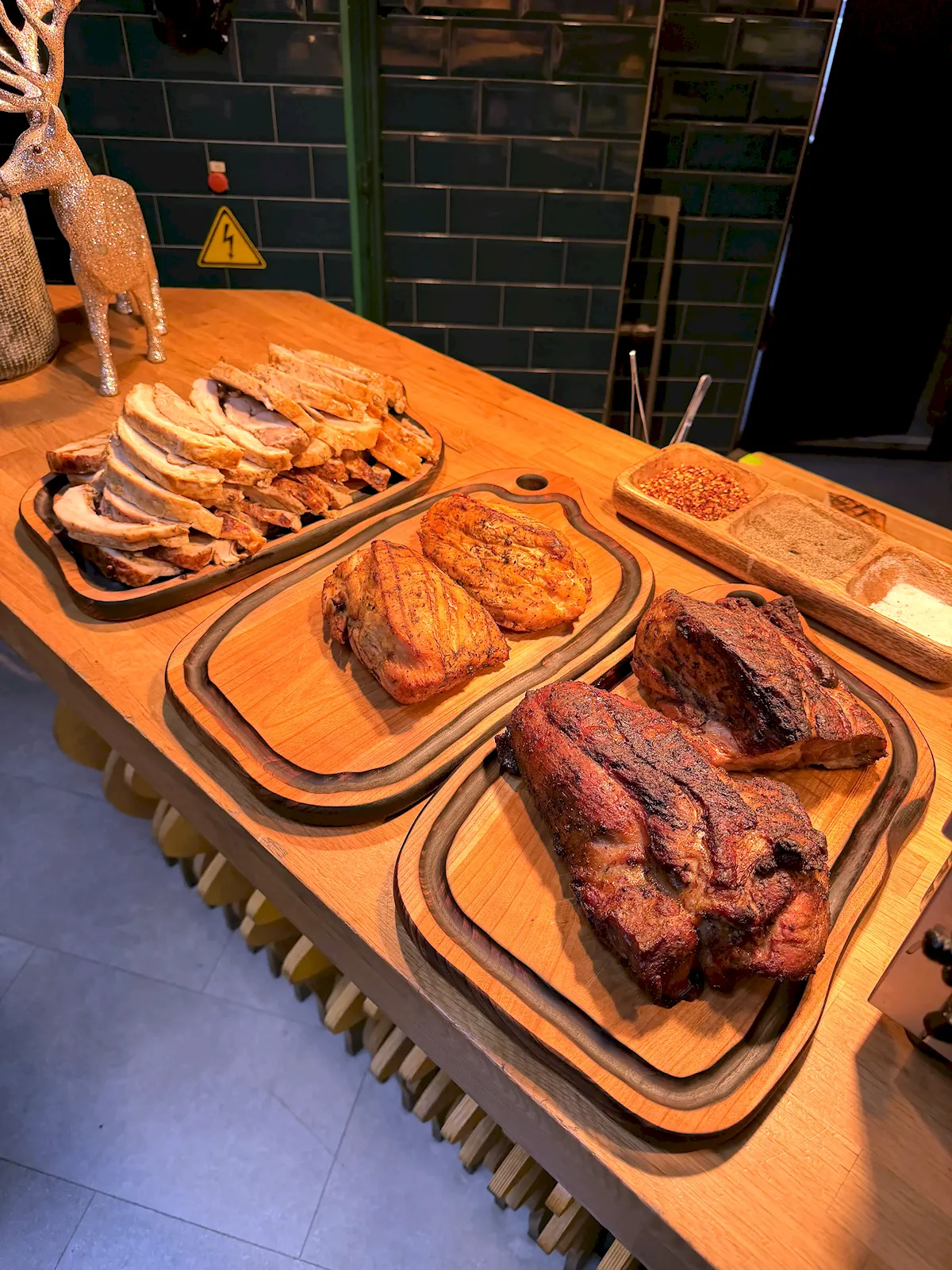 “Partea caldă”, cum scria în meniu, era pusă în zona lor de live cooking. Aveau acolo tacos de porc cu legume la grătar (cu reducție de rodie). Mai aveau și trei fripturi, adică porchetta, curcan și încă o parte de porc. Pe acestea nu le luai tu, ci era acolo un bucătar care ți le gătea pe loc, la comandă.