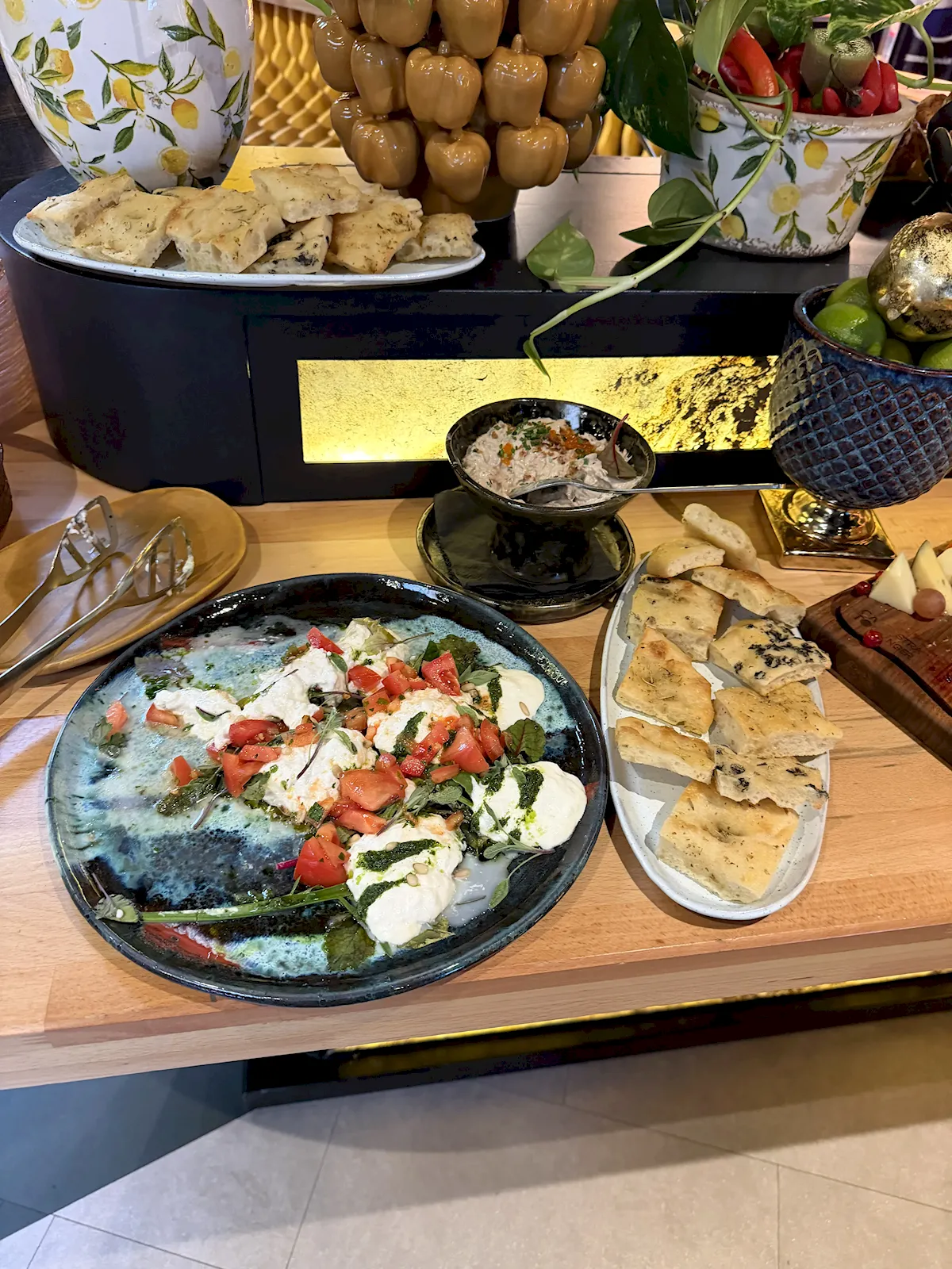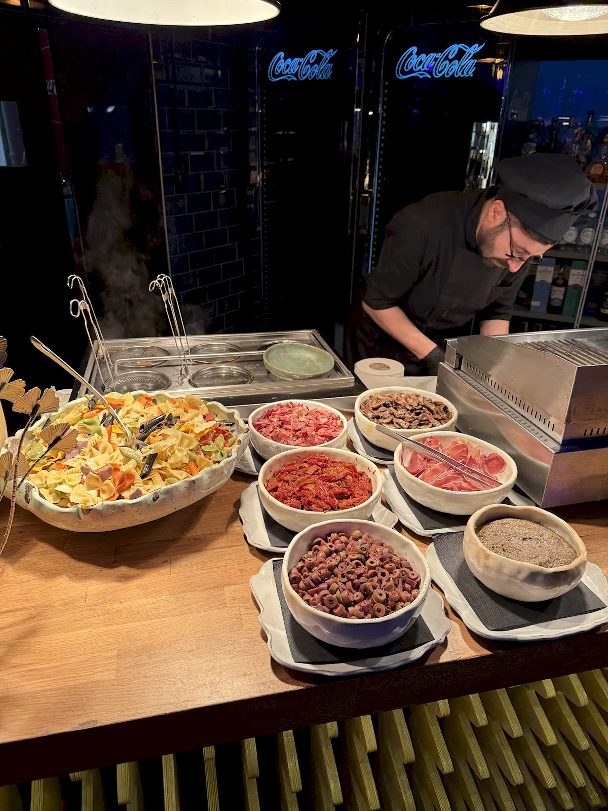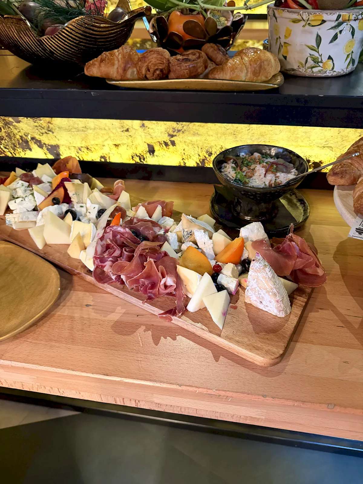 A fost totul foarte bine. Erau mai multe platouri cu aperitive, precum un platou cu vreo 5 tipuri de brânzeturi, prosciutto crudo, o salată Caesar de curcan, burrata, focaccia, o salată cu somon afumat și altele. Cred că le mai și rotesc de-a lungul orelor pentru că la un moment dat a ieșit și un quiche cu somon care a fost excelent. Nu-s fan quicheuri, dar acesta a fost de lins farfuria.