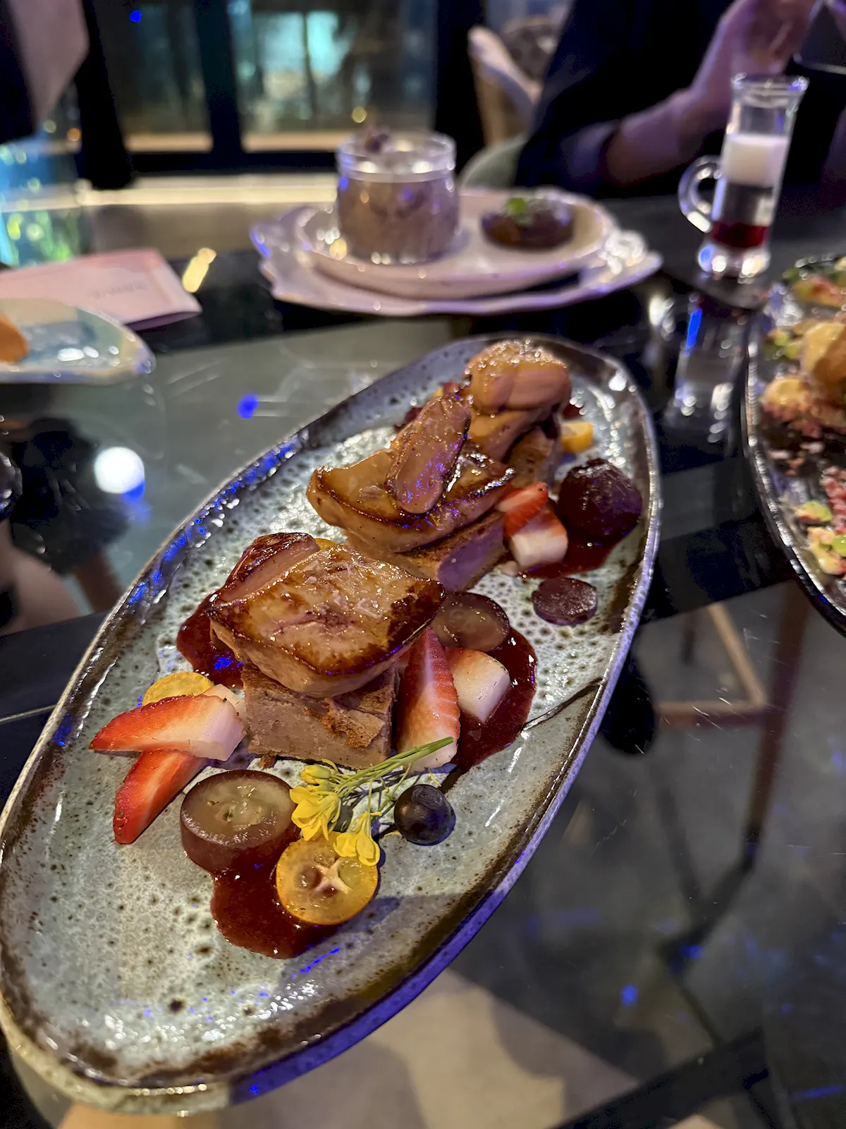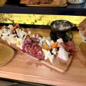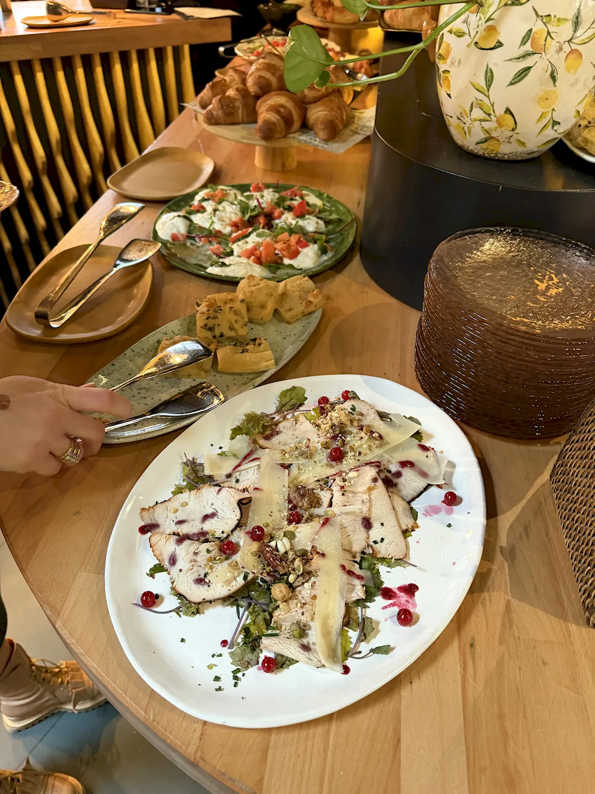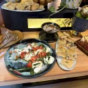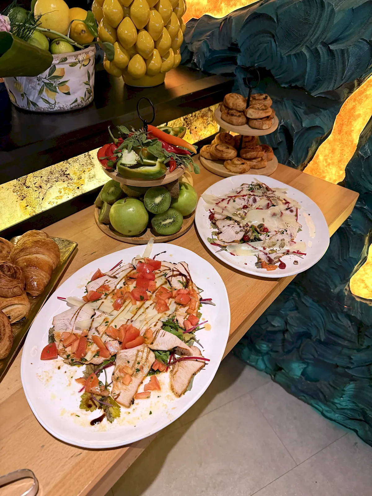 A fost totul foarte bine. Erau mai multe platouri cu aperitive, precum un platou cu vreo 5 tipuri de brânzeturi, prosciutto crudo, o salată Caesar de curcan, burrata, focaccia, o salată cu somon afumat și altele. Cred că le mai și rotesc de-a lungul orelor pentru că la un moment dat a ieșit și un quiche cu somon care a fost excelent. Nu-s fan quicheuri, dar acesta a fost de lins farfuria.