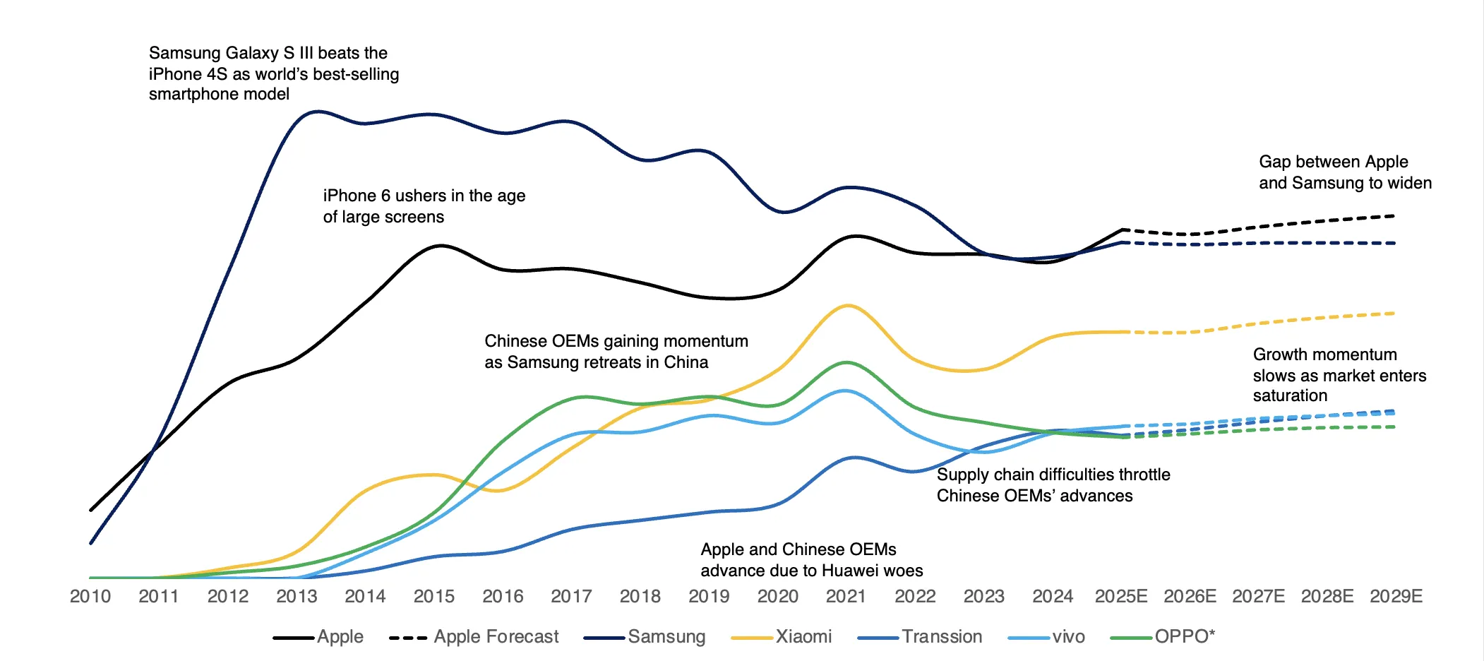 Nu am o explicație clară. Acele statistici erau de la Canalys, oricum, nu Counterpoint. De asemenea, poate că în cele din urmă Apple nu a depășit Samsung chiar atunci sau poate că a făcut-o pentru o perioadă scurtă de timp. Dacă vă uitați la graficul de mai sus, se vede că în 2024 cele două companii s-au atins un pic, apoi Samsung a revenit.