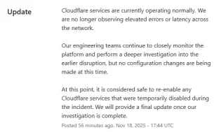 La 17:44, Cloudflare a anunțat rezolvarea problemelor, chiar dacă multe site-uri deveniseră operaționale încă de la prânz. Puteți citi aici toate updateurile:
