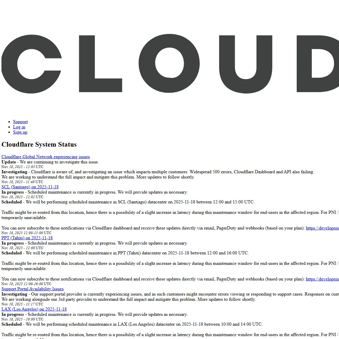 Inclusiv propriul site Cloudflare avea probleme de afișare pentru că o parte dintre fișierele sale erau ținute pe infrastructura Cloudflare care a picat.