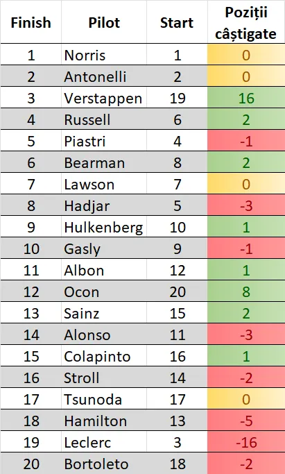 În formă și mai bună a fost Verstappen, care a fost vedeta cursei. A recuperat poziții la start, a schimbat pneurile în cele mai bune momente și la un moment dat a fost chiar la conducerea cursei. Un alt schimb de pneuri l-a dus mai în spate, dar cu pneuri noi față de alți concurenți, a reușit să urce în clasament și să treacă de Russell. 2️⃣Antonelli a ajuns pe locul 2, 3️⃣Verstappen pe locul 3, apoi 4️⃣Russell și 5️⃣Piastri.