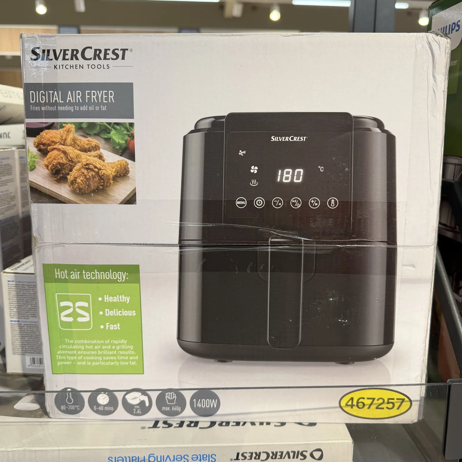 În altă parte, aveau air fryer Silvercrest cu 199 de lei, de zici că era Black Friday. 2,4 litri avea capacitate, 2400W, probabil o ofertă bună dacă păstrați bonul pentru garanție.