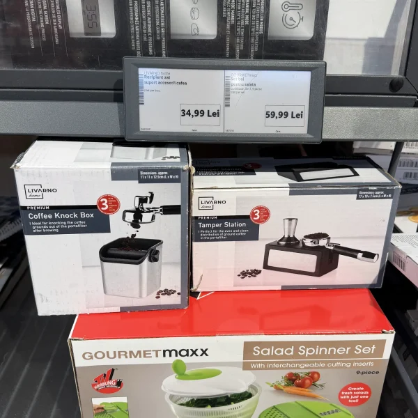 Mai vinde și un coș de gunoi pentru pucuri de cafea, care costă 39 de lei. Tamper Station-ul nu știu cât costă. Acestea sunt accesorii pentru cei care vor să-și facă pe blat un spațiu de cafea exact ca în cafenele, cu espressor, râșnită, stație de tampare, recipient de pucuri etc.