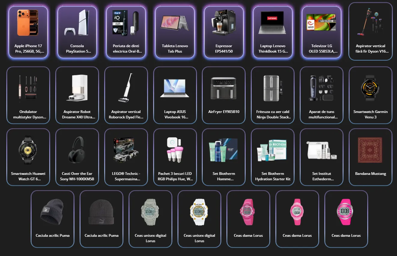Premiile care pot fi câștigate sunt cele de mai jos. Sper să câștig iPhone 17 Pro Max, nu o căciulă Puma, ca să zic așa. Extragerile vor avea loc pe 27 noiembrie.