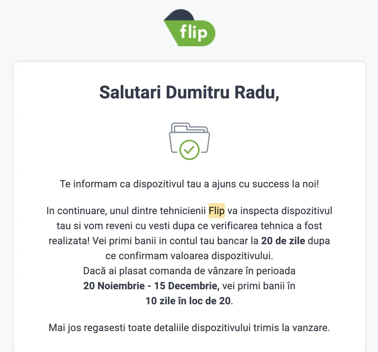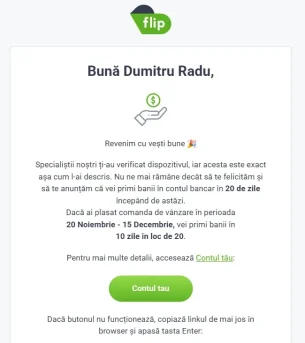 L-am ambalat și l-am pus la un easybox. Două zile mai târziu am primit email că a intrat în evidența Flip: