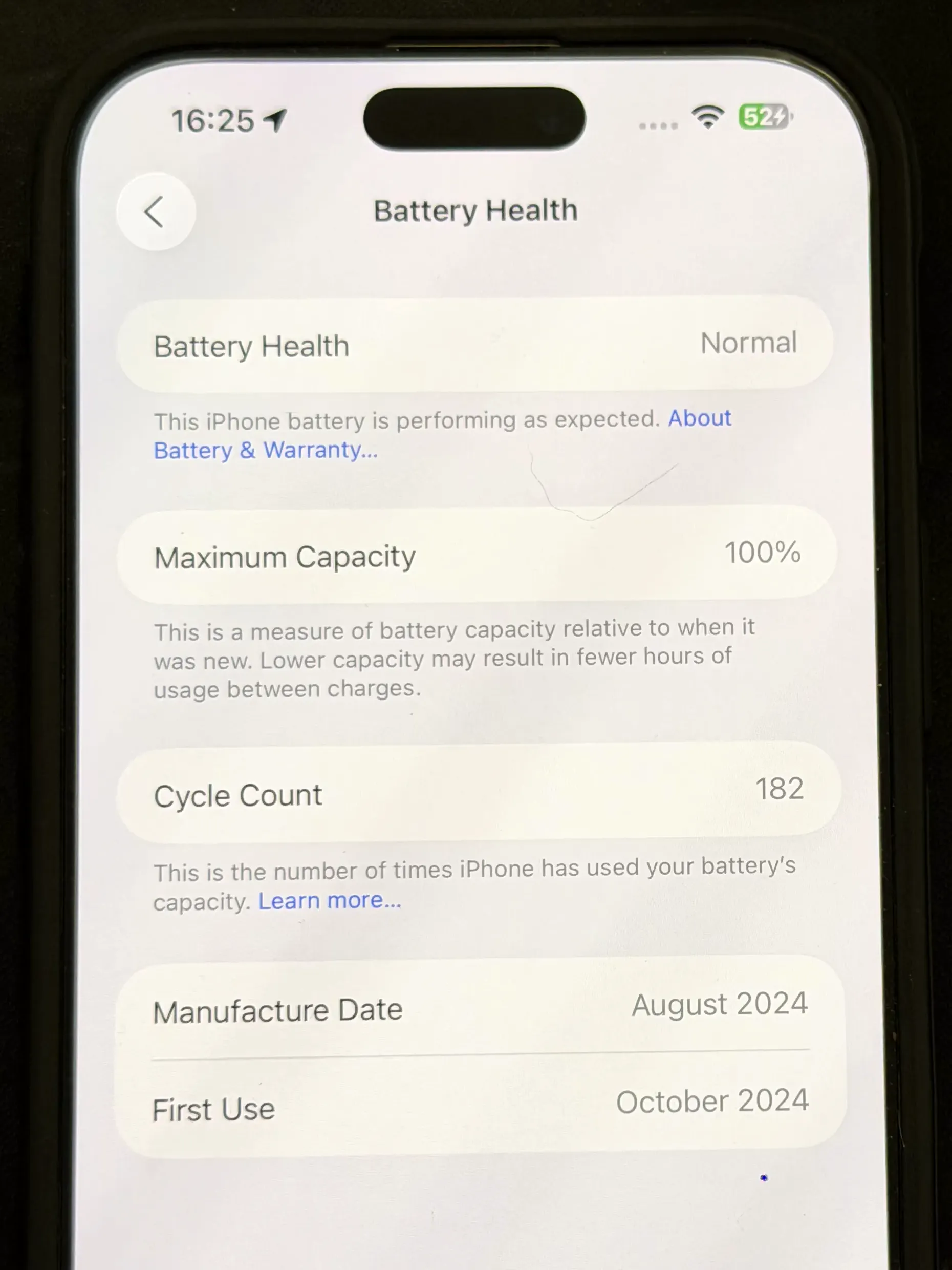 Bateria este, de asemenea, la 100% capacitate maximă:
