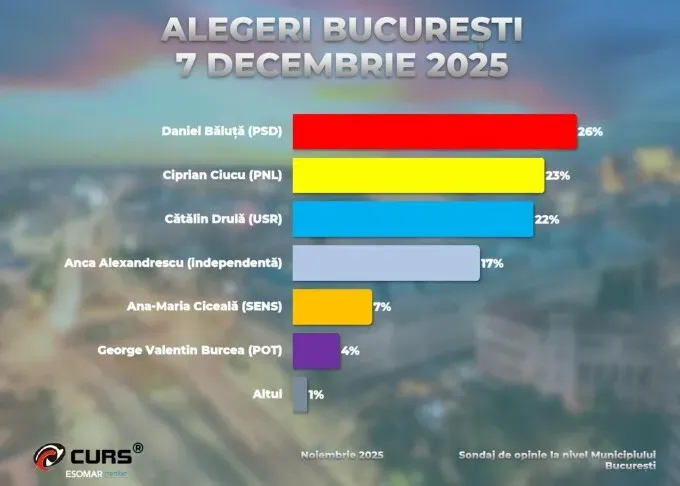 Situația în București, cel puțin în sondaje, este foarte rea pentru bucureșteni. Băluță, primarul PSD al sectorului 4, conduce cu un avans de 3%. Îl urmează Ciucu și Drulă, practic la egalitate, și apoi Anca Alexandrescu.