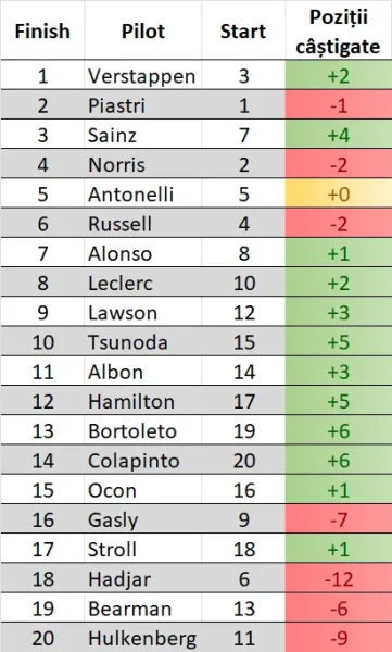 Vă spun mai jos care a fost treaba cu cele 25 de tururi pentru anvelope, dar și în ce condiții pot deveni campioni Norris, Piastri sau Verstappen.