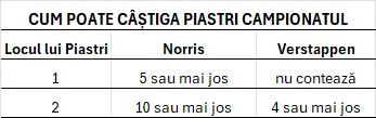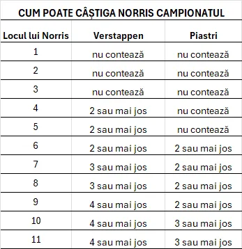 Norris are +12 față de Verstappen și +16 față de Piastri. Toți trei au șanse la titlul mondial. Să facem calculele:
