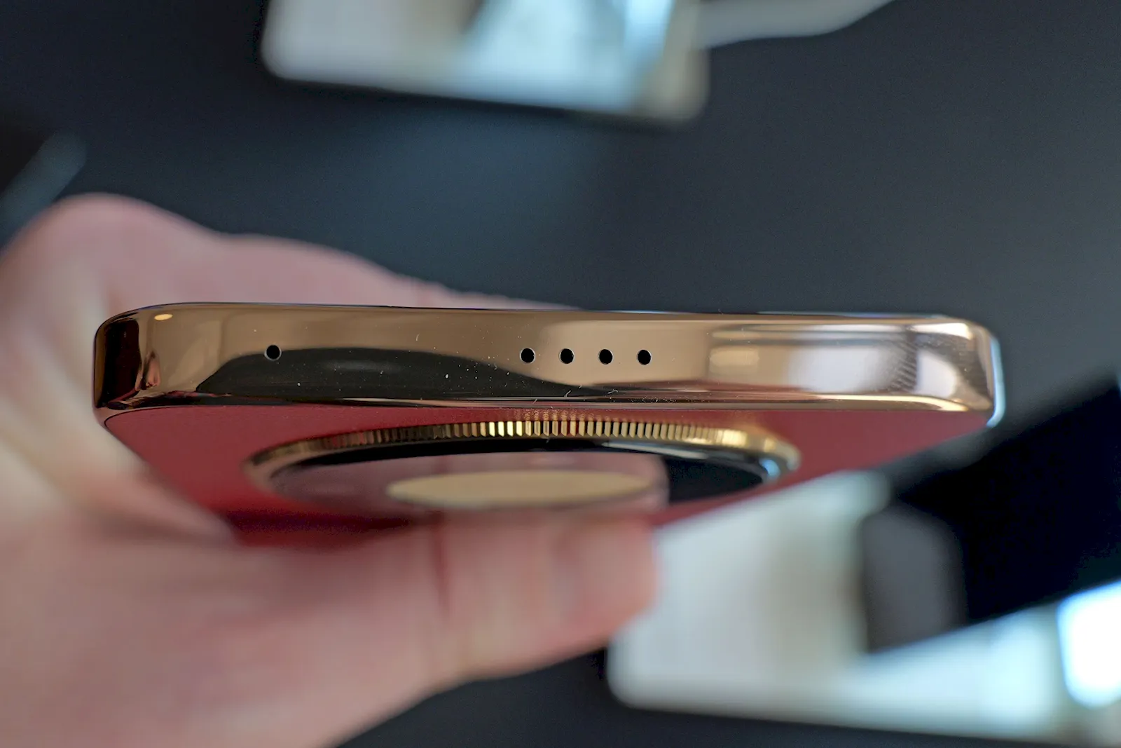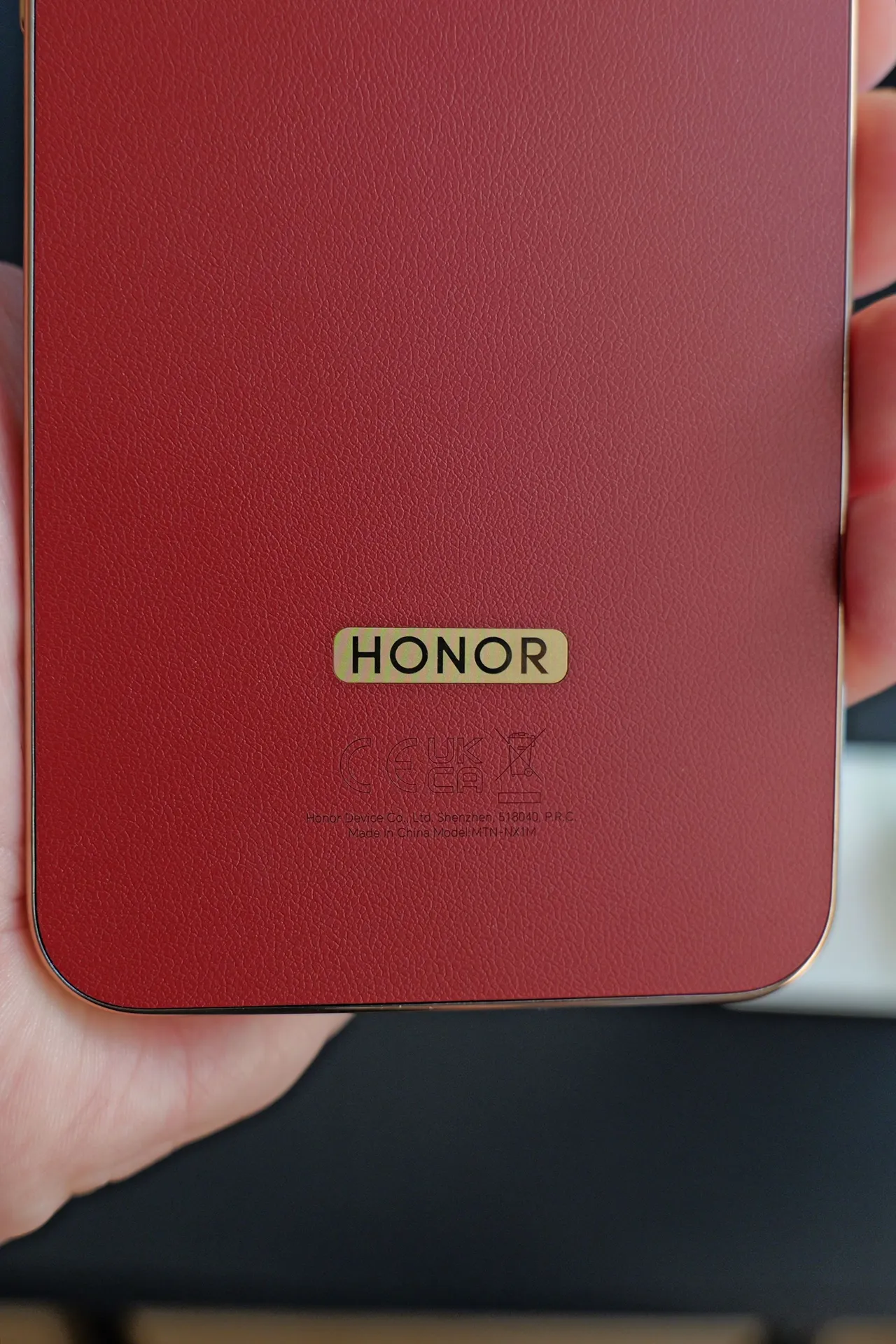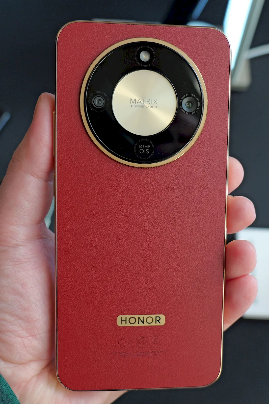 Varianta roșie mi-a plăcut însă cel mai mult pentru că spatele este acoperit cu o piele vegană, care îi oferă o textură foarte discretă și o priză mult mai bună în mână, iar culoarea aceea ușor cărămizie este foarte plăcută. Arată a telefon elegant, chiar flagship, pe această configurație.