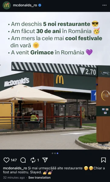 Dau pe Instagram peste perla de mai jos dată pe contul McDonald’s. Este o postare în care se laudă că a fost un an bun: au deschis 5 restaurante noi, au împlinit 30 de ani în România, au fost la multe festivale.