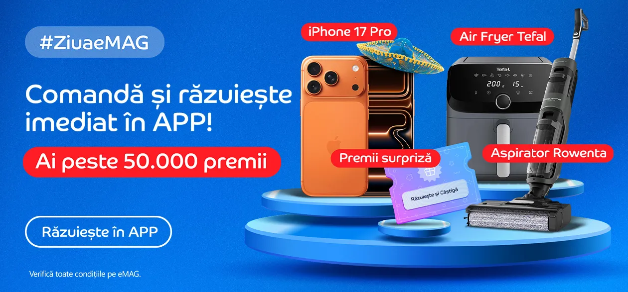 Anyway, Ziua eMAG. A avut multe forme de-a lungul anilor, uneori cu vouchere de reducere, acum este cu cartonașe de răzuit. Sunt de fapt zilele eMAG, campania ține până pe 4 decembrie, și pentru fiecare comandă cu valoare mai mare de 150 de lei, primiți un cartonaș virtual de răzuit. Primiți maxim 3 pe zi. Puteți comanda de oriunde, dar cartonașele se vor vedea și răzui în aceste trei zile în aplicația eMAG de mobil. Premiile sunt zeci de mii de vouchere de discount sau reducere sau participări la tombola cu produse.