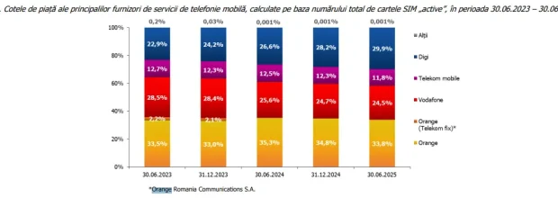 ➡️ Cotele de piață în funcție de SIM-uri active arată Orange la 33,8%, Digi la 29,9% și Vodafone la 24,5%, dar și Telekom la 11,8%.