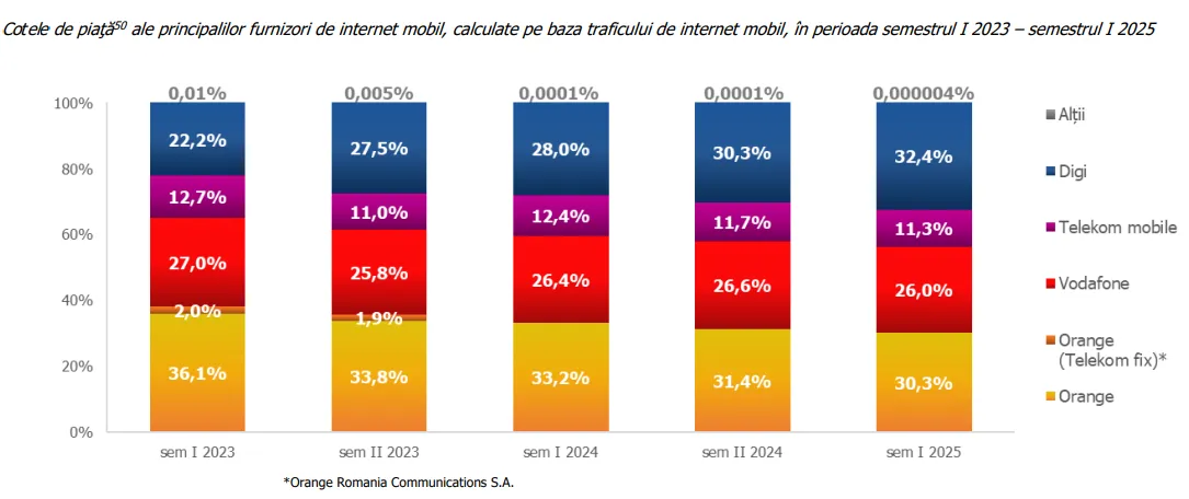 Revenind însă la jumătatea anului 2025, ➡️ cel mai mult trafic pe mobil îl făceau clienții Digi, care în acel semestru i-au depășit pe cei Orange și au trecut pe primul loc:
