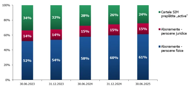 Din 23 de milioane de cartele SIM active, 24% sunt prepay, adică vreo 5,5 milioane. Restul de 17,48 milioane sunt abonamente.
