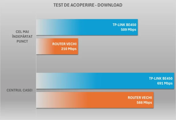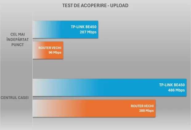 Acoperirea este de asemenea bună, ține fără probleme un apartament de 100 de metri pătrați chiar dacă este instalat într-un capăt al său. Eu am făcut câteva teste before și after față de routerul meu, un TP-Link AX55, testând în același loc, iar banda a crescut foarte mult.