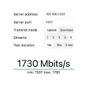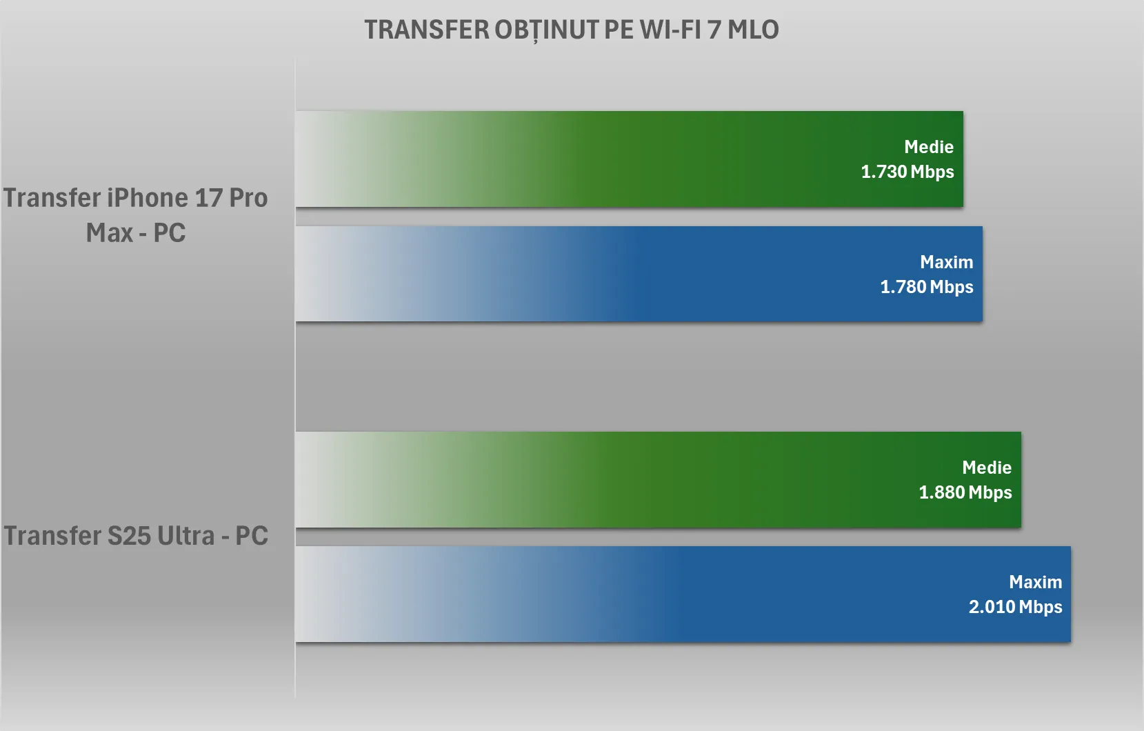 Cu un iPhone 17 Pro Max, am prins 1780 Mbps maxim cu 1730 Mbps media de transfer, un pic mai jos decât pe Samsung, dar pentru mine ambele rezultate sunt dovada că routerul este capabil de transferuri foarte rapide pe wireless.