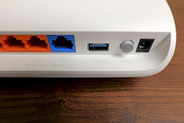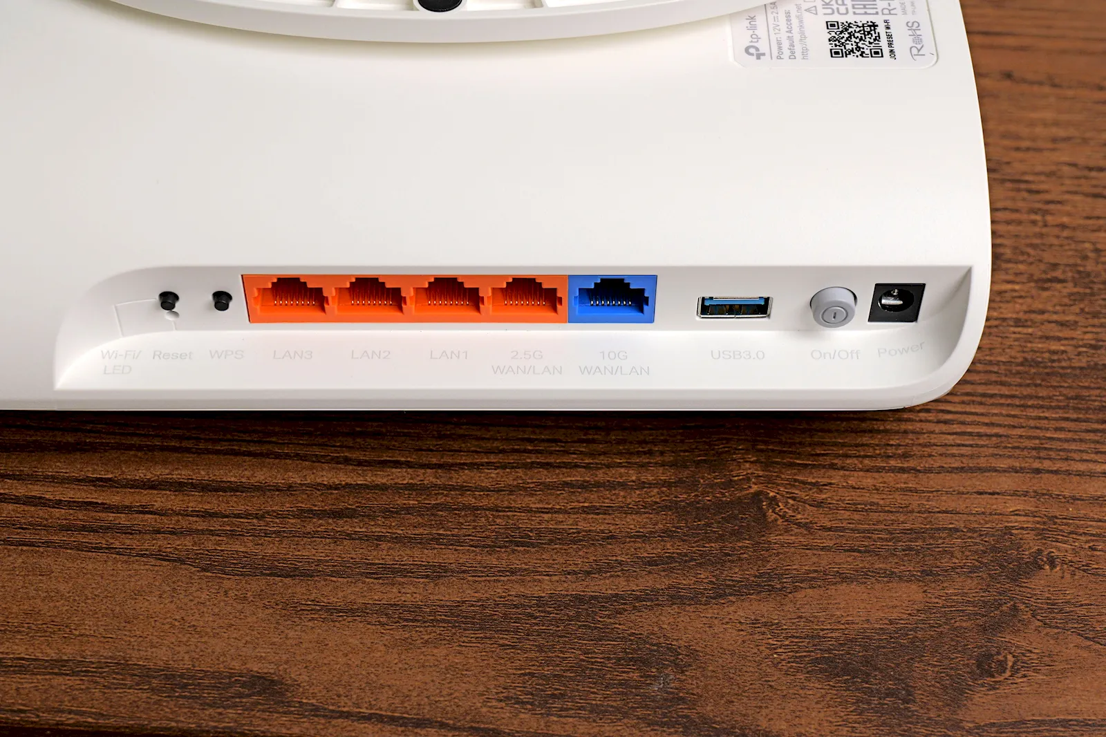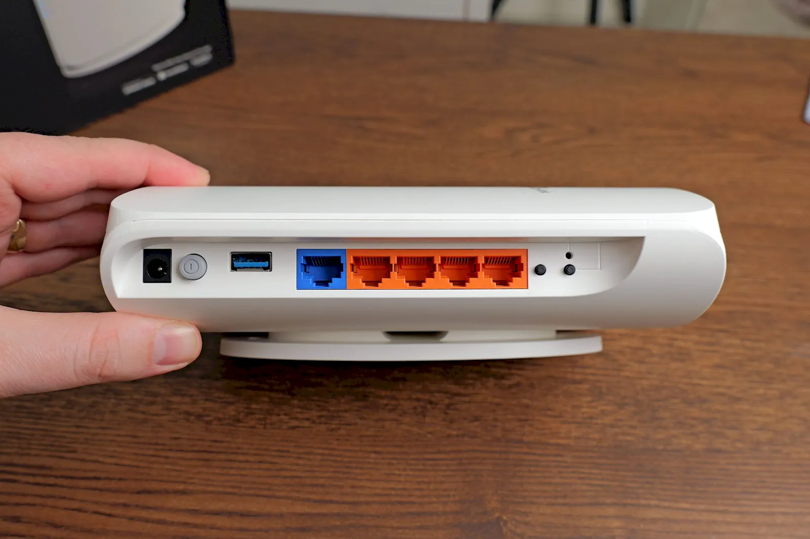Porturile lui BE450 sunt pe partea cealaltă Are un port WAN sau LAN de 10 Gbps, un port WAN sau LAN de 2,5 Gbps și trei porturi LAN de 1 Gbps. Altfel spus, este un router foarte bun pentru conexiuni rapide de 2,5 sau chiar 10 Gbps, cum oferă Digi sau Orange și poate și alți provideri, dar la nevoie și pentru rutare rapidă într-o rețea locală.