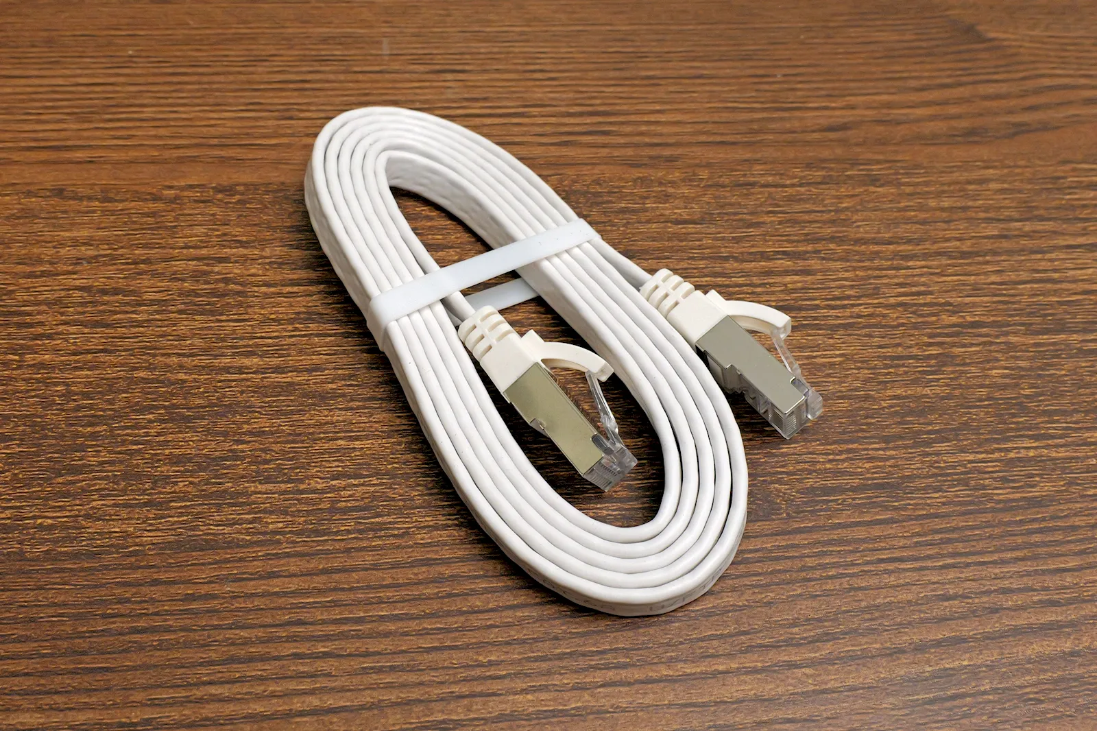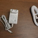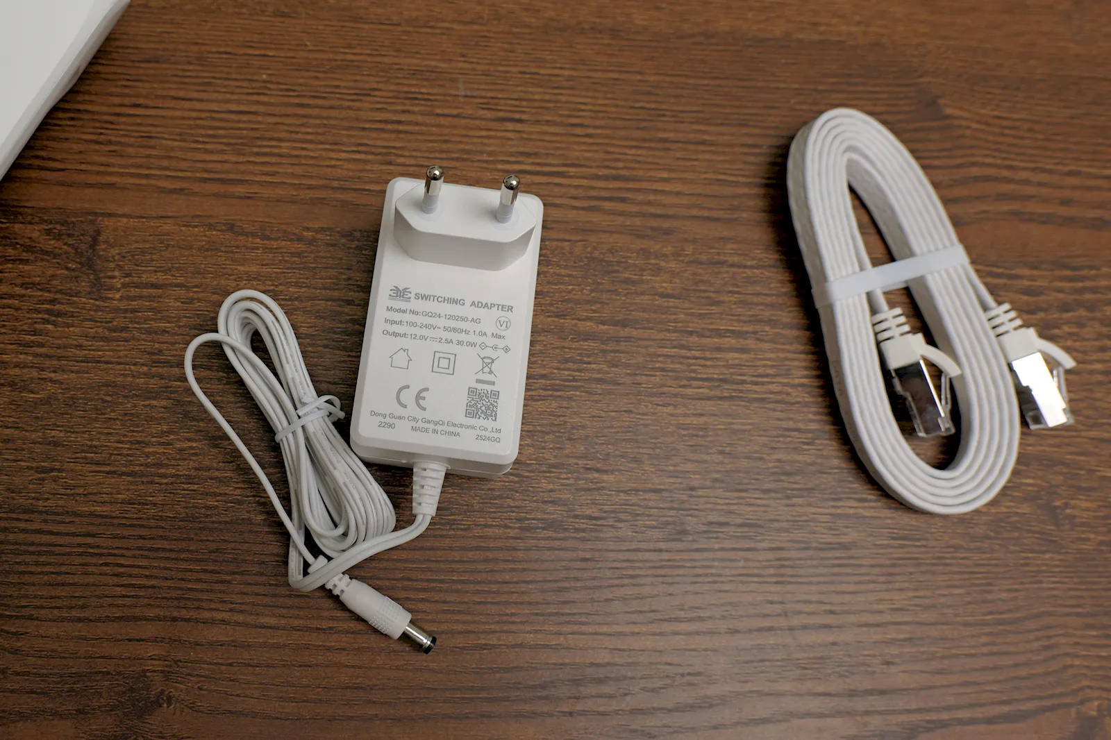 Uitați cum arată. Pachetul include routerul, un alimentator cu mufă rotundă, un mic patch-cord cu cablu plat și un suport.