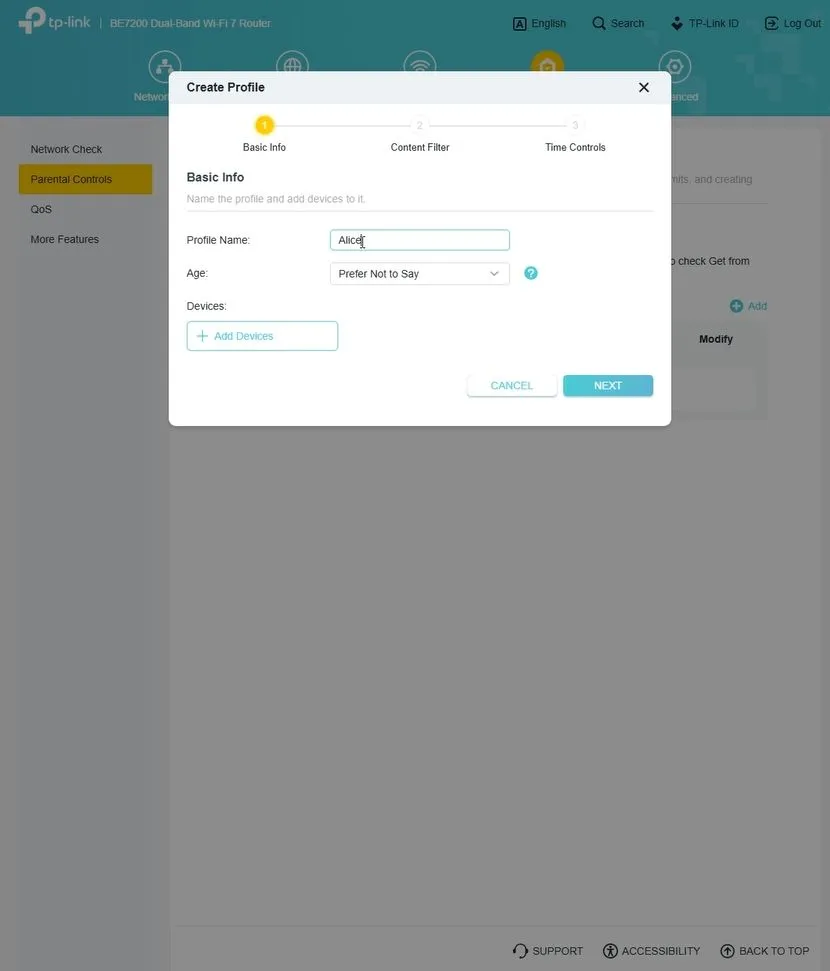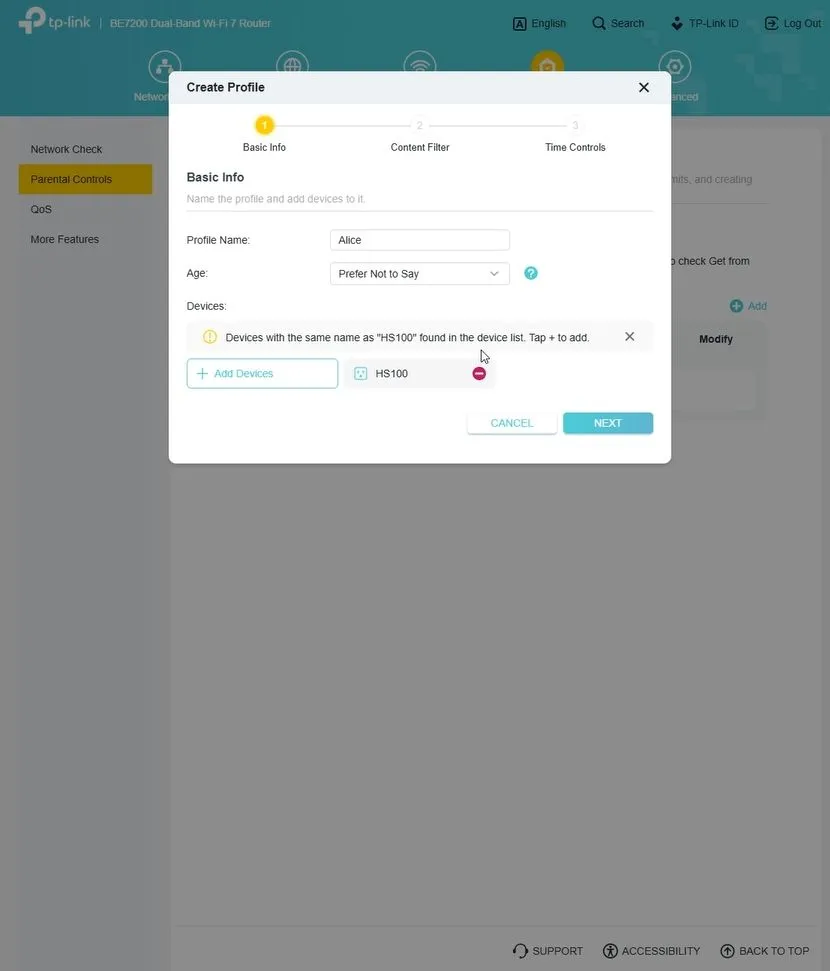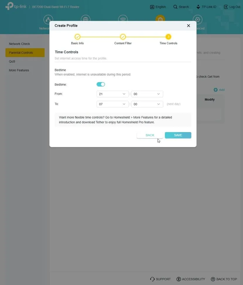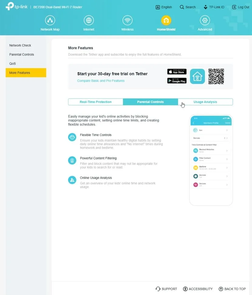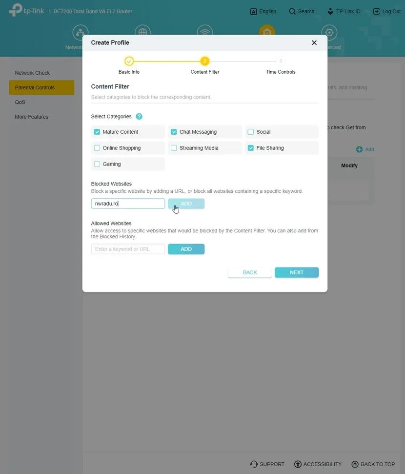 Routerul acesta BE450 include o opțiune de scanare a rețelei care vă dă un fel de notă de securitate. Mai sunt și opțiuni de control parental. Puteți crea pentru copii, de exemplu, câte un profil prin care să reglați pe ce fel de site-uri sau de servicii au voie să intre și chiar să blocați sau nu individual anumite site-uri. Puteți grupa dispozitivele astfel încât telefonul copilului să aibă acces doar la mesagerie și YouTube, dar nu și la Internet sau nu la anumite tipuri de site-uri de pe Internet.