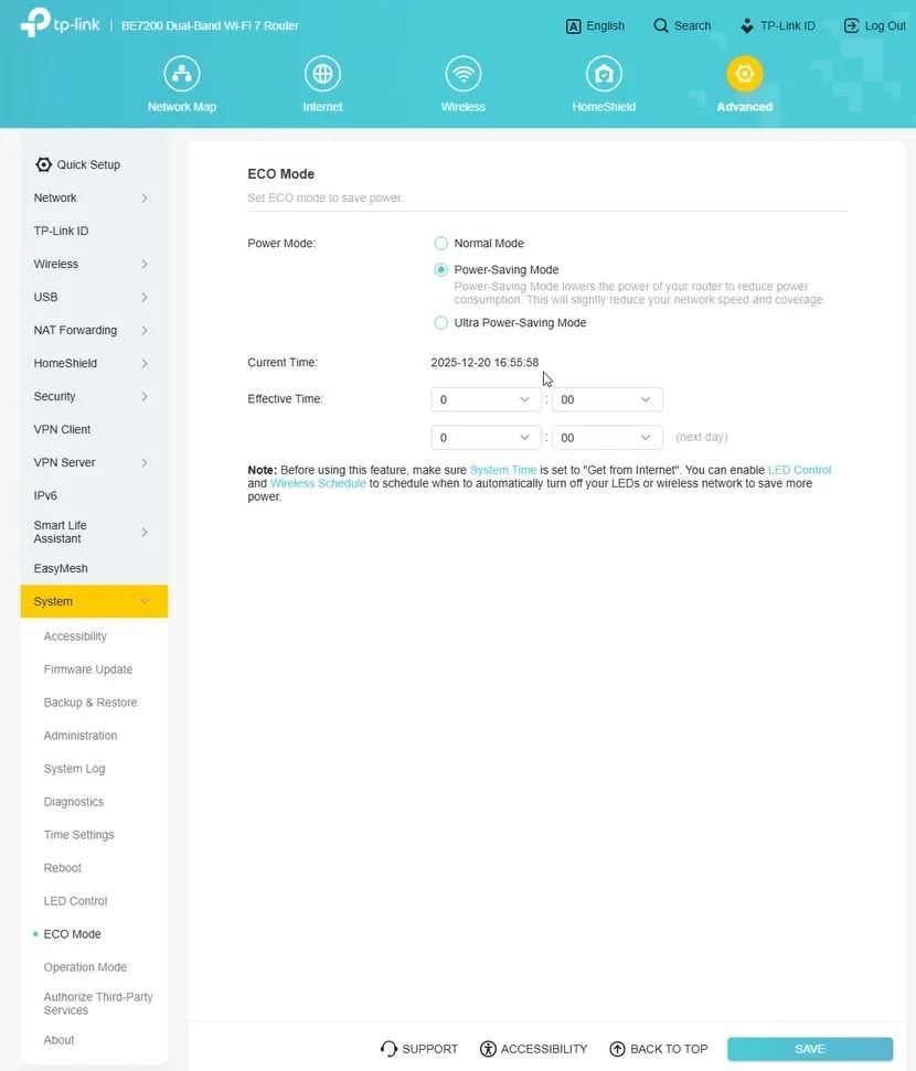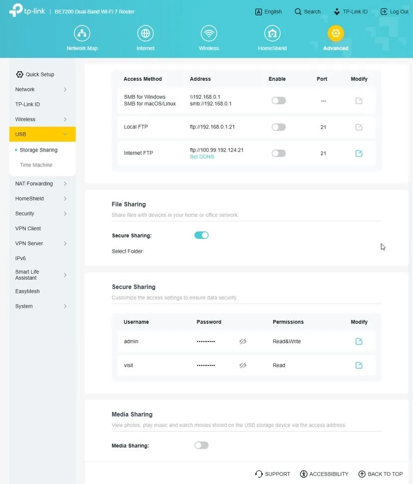 TP-Link BE450 are și un port USB 3.0, care poate fi utilizat pentru o stocare externă, de exemplu un hard-disk sau SSD conectat acolo. În meniul routerului sunt opțiuni de configurare ca share în rețea, Samba, Time Machine și altele.