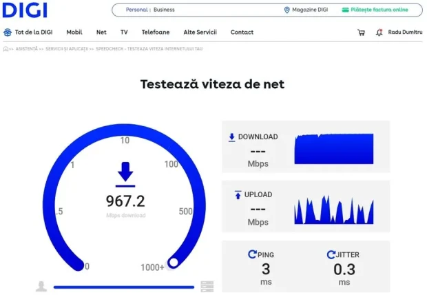 Păi evident, pe conexiunea mea Digi de 1 Gbps a mers la maxim în teste, am obținut 969 Mbps pe cablu. Routerul acesta este gândit mai degrabă pentru conexiuni de 2,5 și chiar 10 Gbps, din moment ce are astfel de porturi pe el, și, în principiu, va funcționa foarte bine pe ele, împărțind apoi o astfel de conexiune către multe dispozitive wireless.