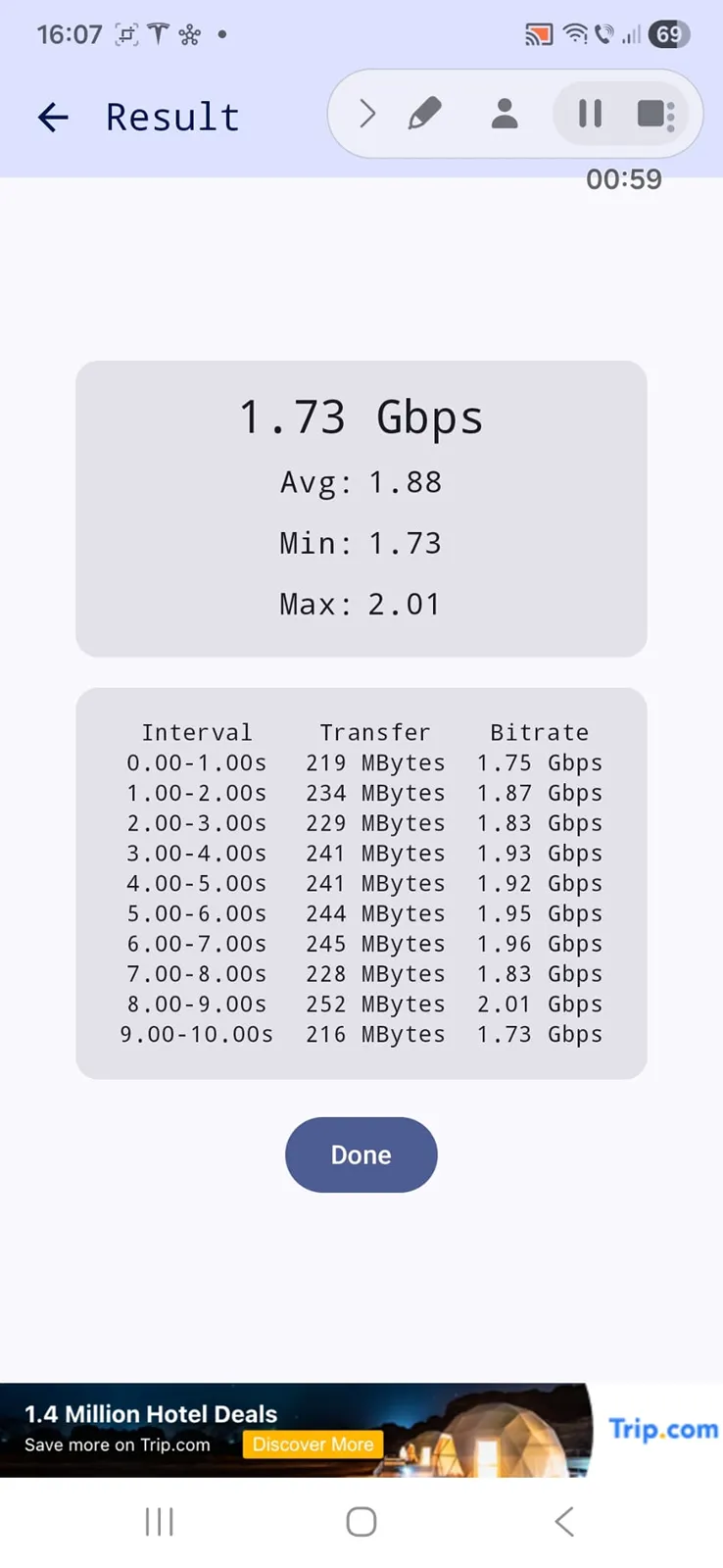 Pe wireless, banda maximă pe care am prins-o cu un singur dispozitiv a fost de 2,01 Gbps. Am folosit un Samsung S25 Ultra pentru asta, care suportă Wi-Fi 7 cu MLO.
