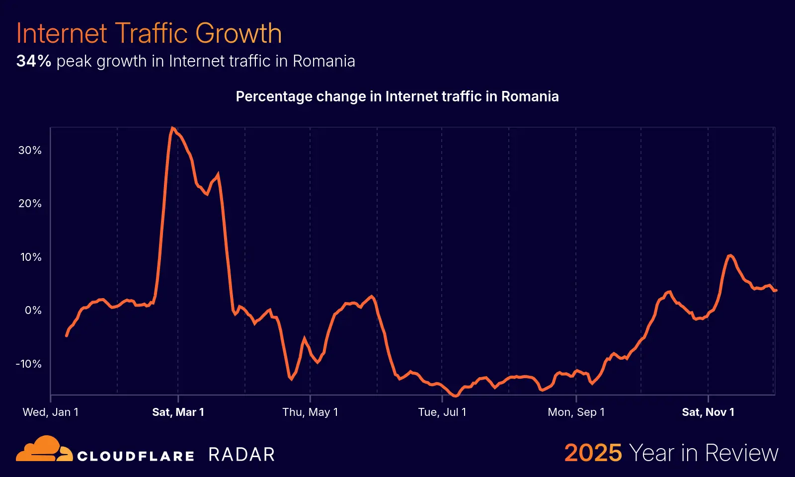 Cloudflare, un serviciu prin care trece un volum semnificativ din traficul total de date din Internet, a dat publicului statistici sub forma unui Year in Review. Puteți vedea și datele pentru România.