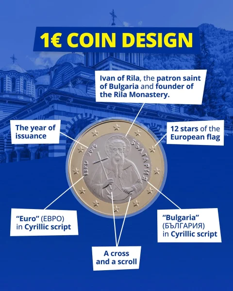 Moneda de 1 euro a bulgarilor, însă, îl înfățișează pe sfântul Ioan de Rila, Ivan of Rila în engleză, patronul spiritual al țării. A fost un călugăr din secolul 9, care a trăit ca pustnic într-o grotă și căruia îi sunt atribuite diverse minuni. Una dintre cele mai mari mânăstiri în poartă numele.